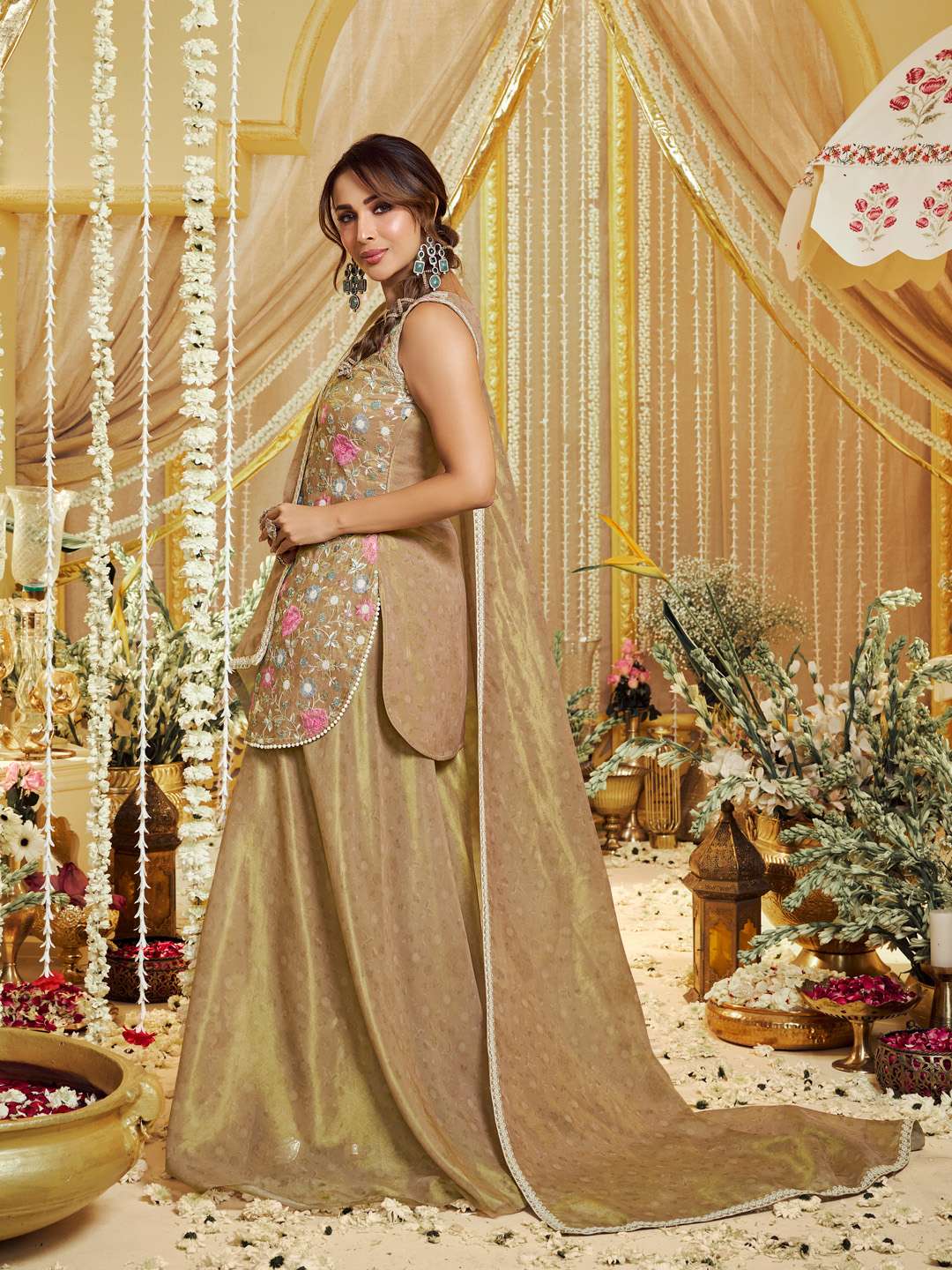 Gold-toned embroidered Kurta with Palazzos with dupatta