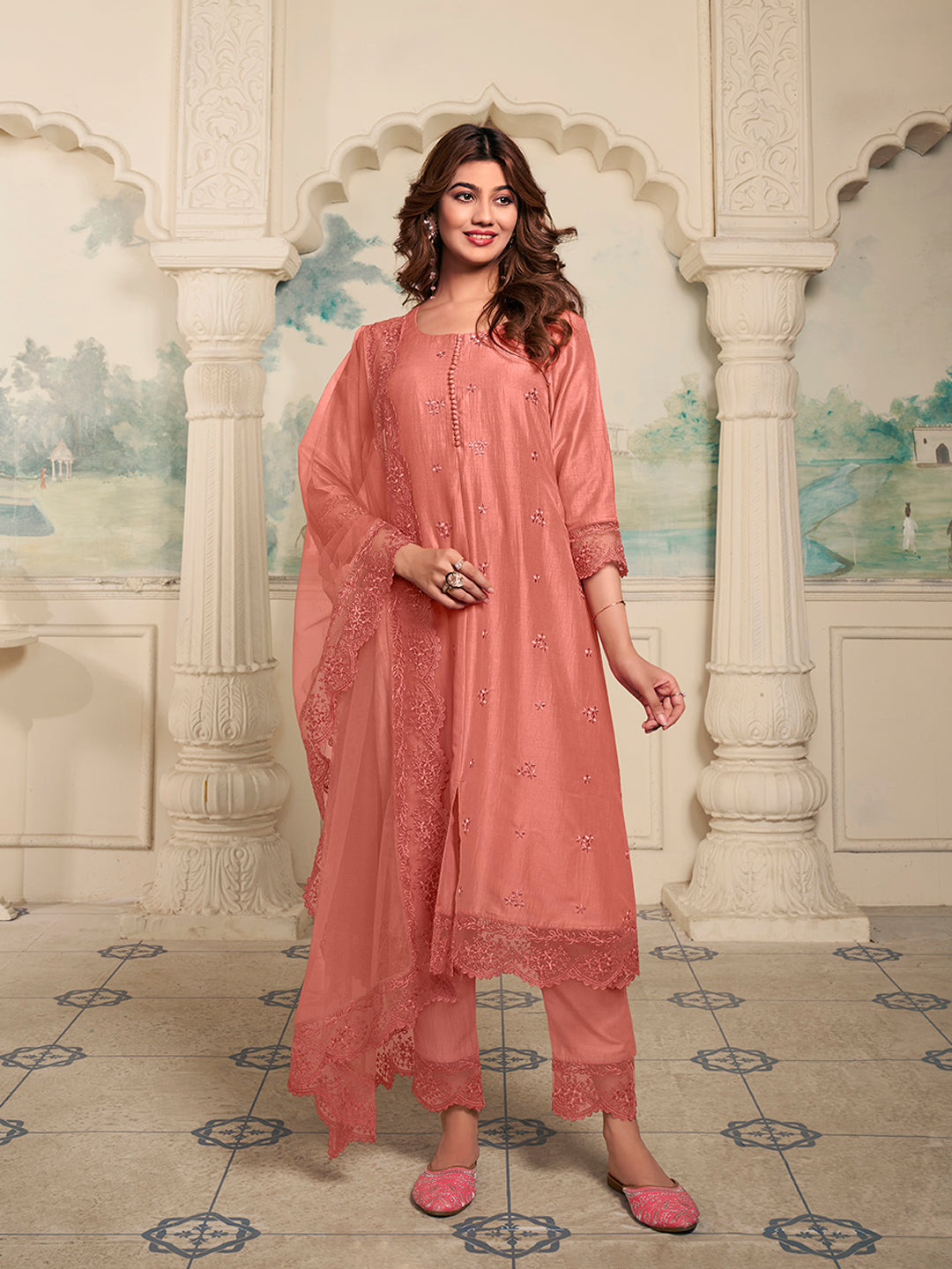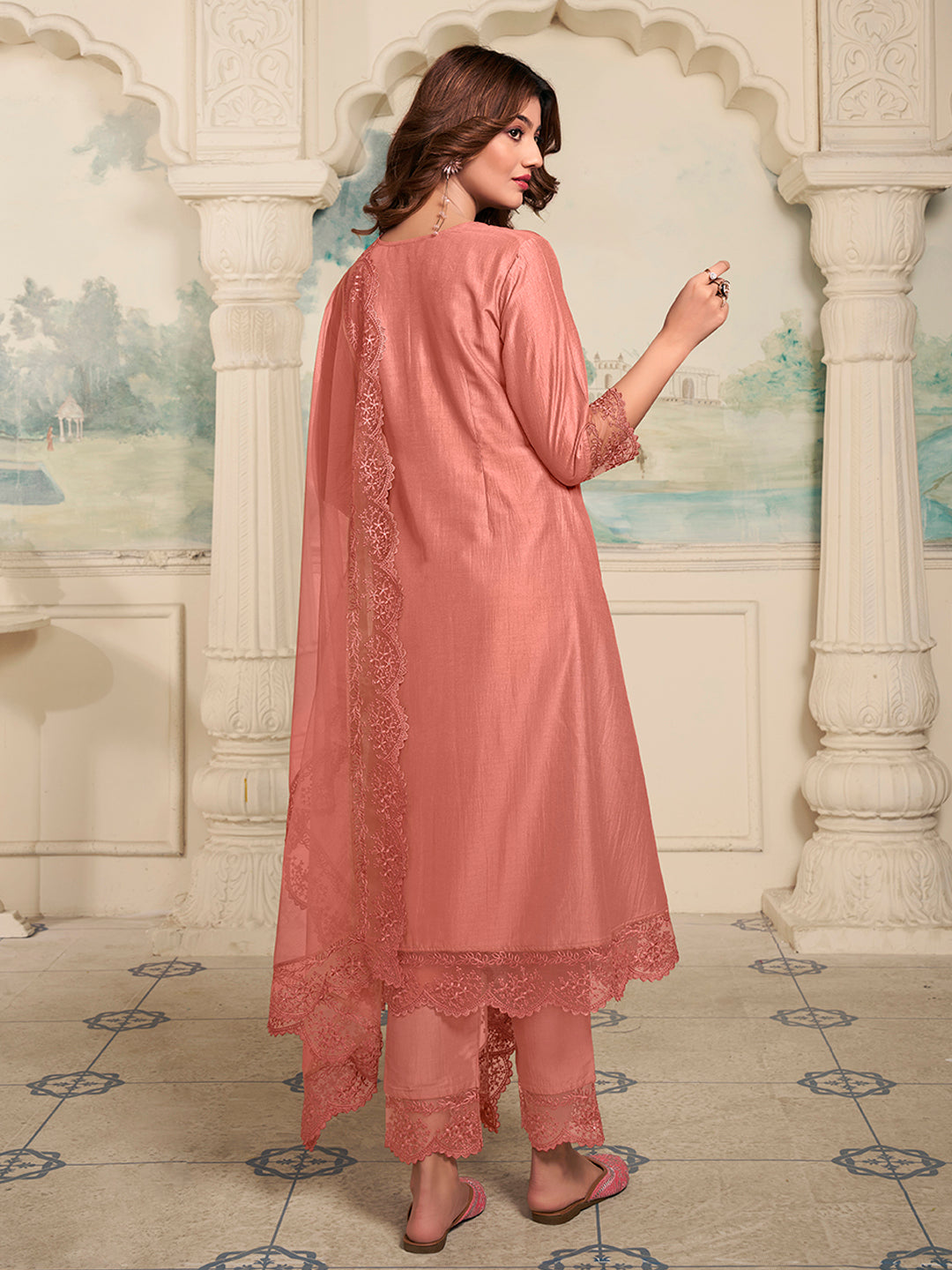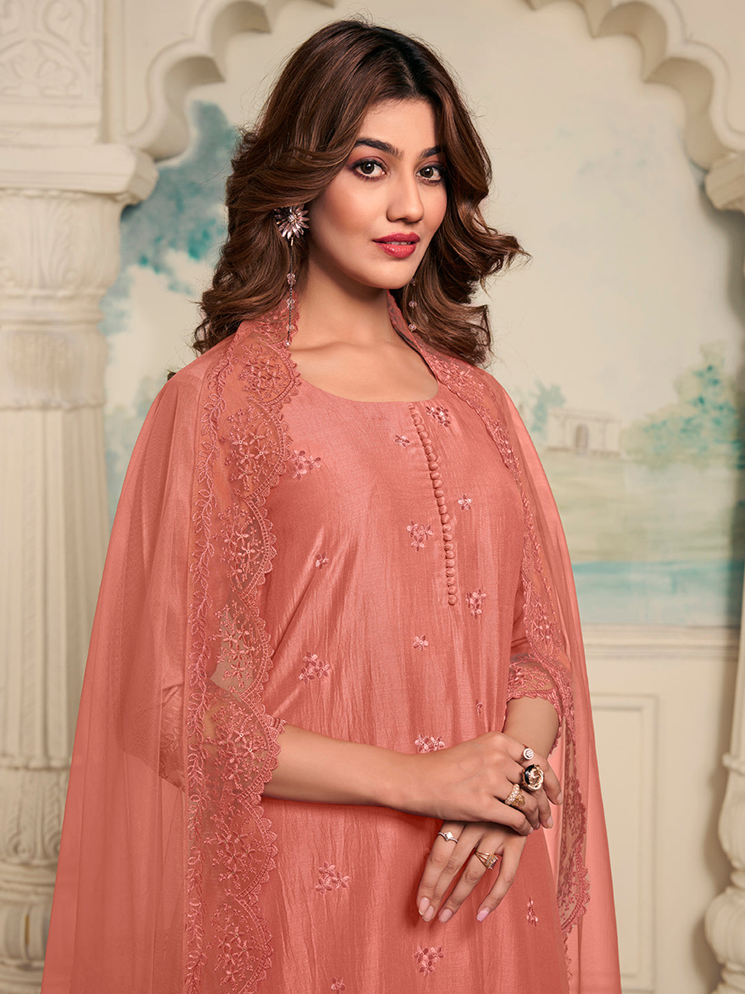 Elevate your ethnic wardrobe with our Peach Floral Embroidered Kurta and Trousers set, complete with a flowy dupatta. The A-line shape and regular style, along with the delicate floral embroidery, add a touch of elegance to this outfit. Made with a silk blend, the kurta and trousers provide a comfortable fit, while the net dupatta adds a graceful touch. Perfect for any occasion, simply dry clean to keep this ensemble looking its best. Available in size S, this set is a must-have for your collection.