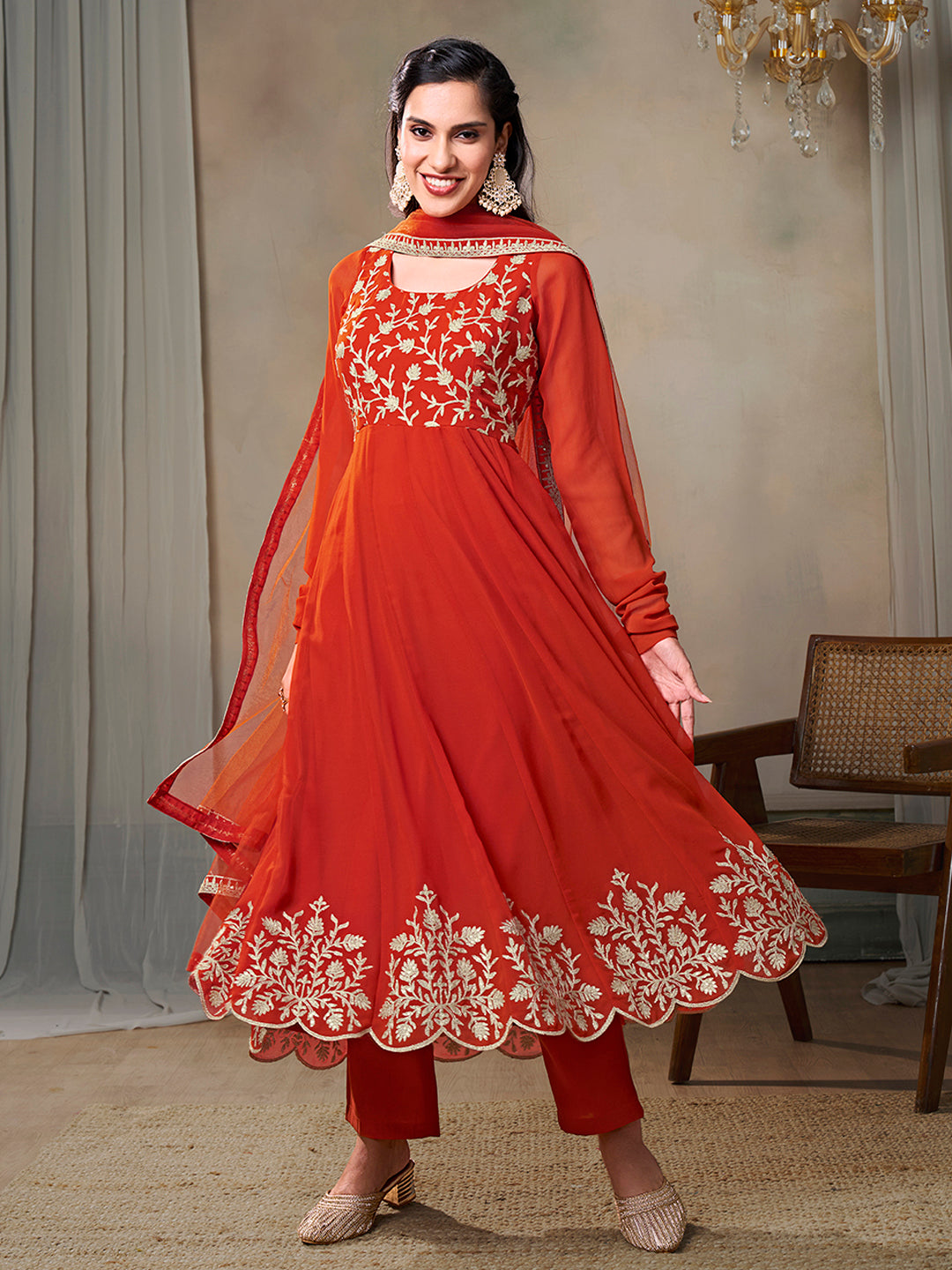 Elevate your ethnic wardrobe with this rust floral embroidered Anarkali kurta set. Made from georgette fabric, it features a U-neck, long sleeves, and na pockets for added convenience. Paired with solid trousers with a partially elasticated waistband, this set is perfect for any occasion.