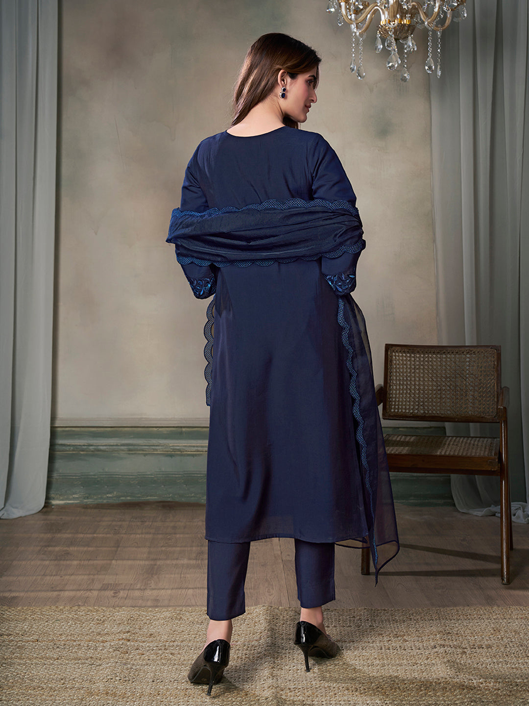 This navy blue Kurta with Trousers and dupatta features a beautiful floral embroidered design, making it a stylish and trendy choice. Made from pure silk, the Kurta has a straight shape with three-quarter flared sleeves and a u-neck. The thread work detail and slip-on closure make it an easy and comfortable option. Perfect for any occasion, the calf length Kurta and solid Trousers offer a sleek and elegant look.
