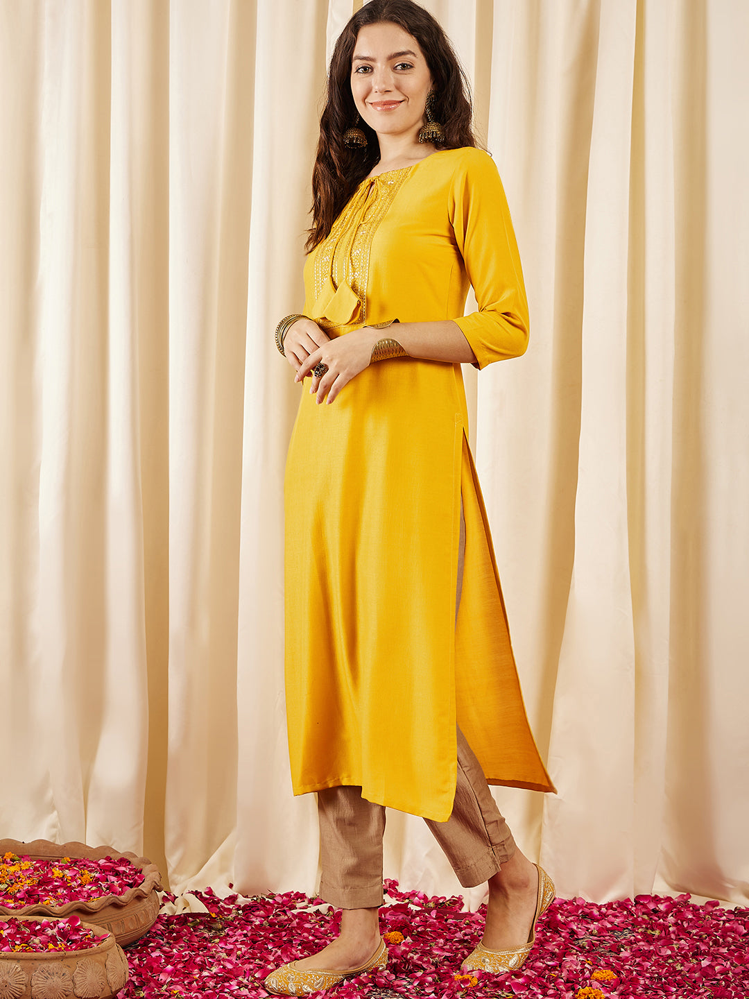 Expertly crafted with a machine-woven regular silk, this Women Floral Embroidered Sequinned Floral Kurta features a regular straight shape and calf length with straight hem for a comfortable and versatile fit. The mustard yellow color and floral embroidery add a touch of elegance while the sequinned detail adds a touch of sparkle. The tie-up neck and three-quarter regular sleeves complete the look of this must-have kurta.