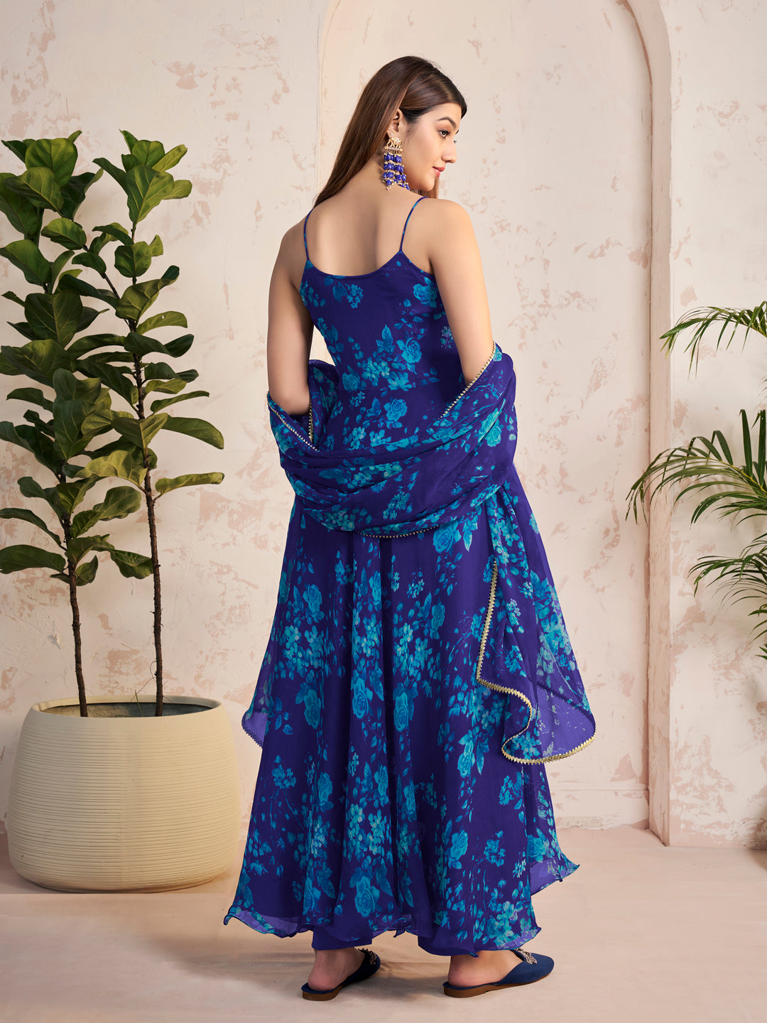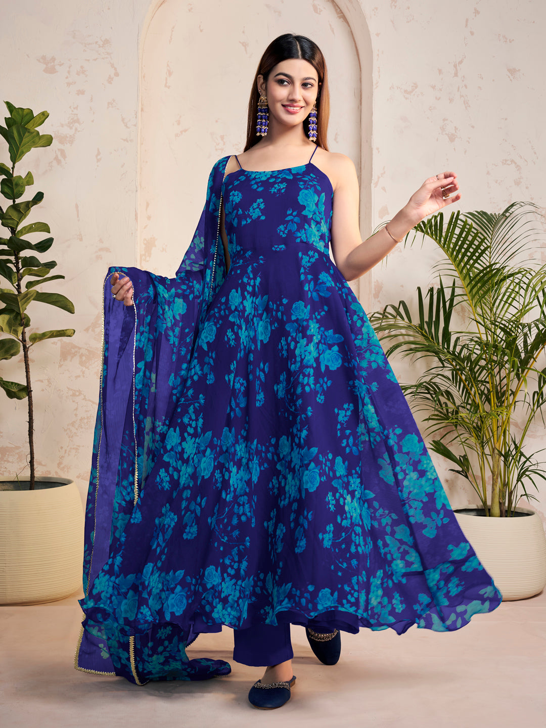 Elevate your ethnic wardrobe with our Women Floral Printed Angrakha Kurta set. The blue Kurta features a captivating floral print in an Anarkali shape with an Angrakha style. Made with poly chiffon, it has a calf-length flared hem and shoulder straps. The solid trousers have an elastic waistband for comfort and ease of wear. Complete the look with the included dupatta.