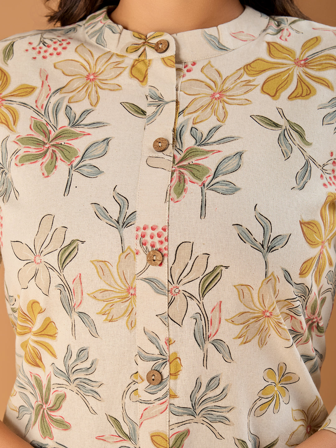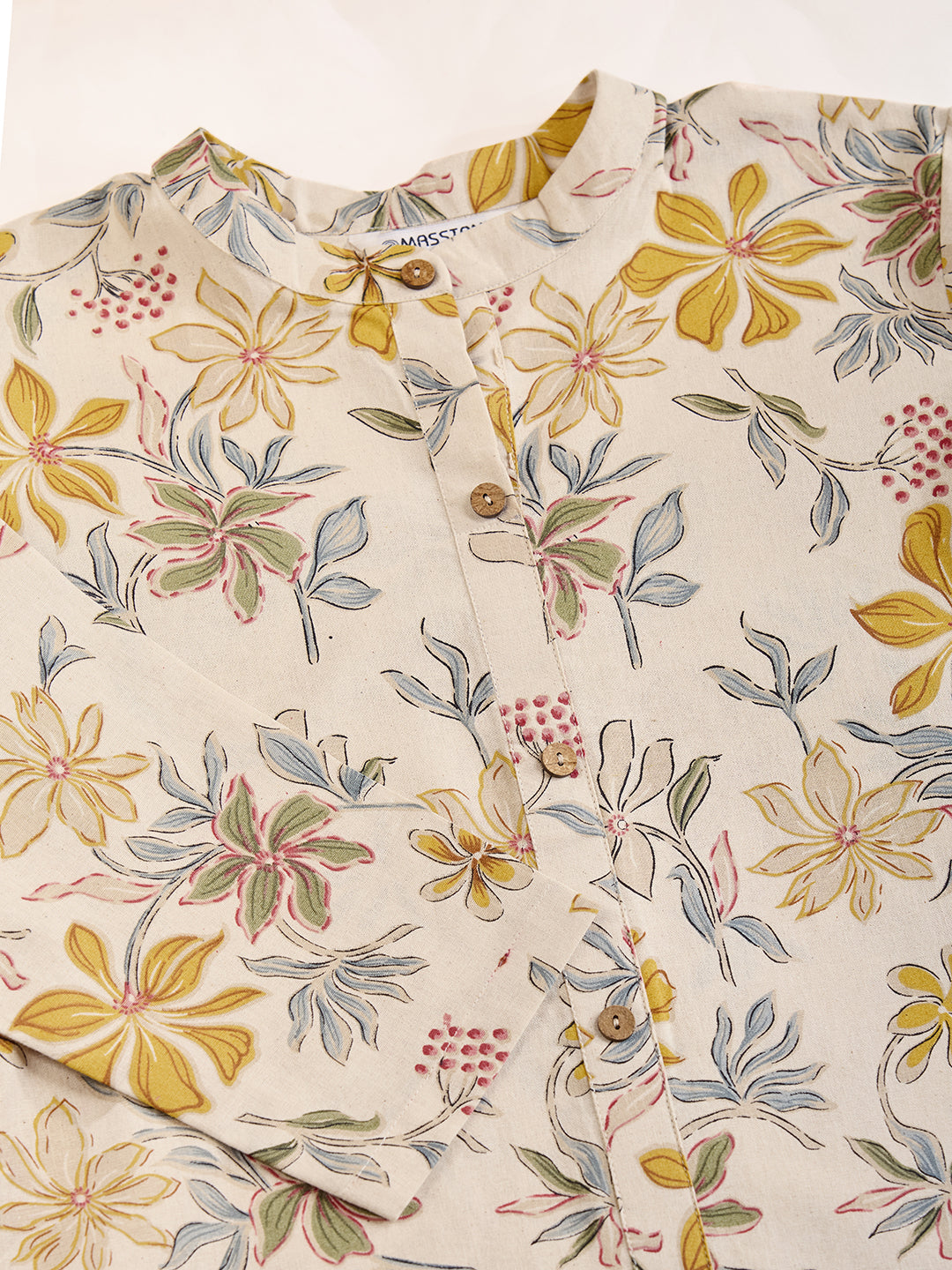 This cream-coloured kurta features a beautiful floral print and a mandarin collar. Its A-line shape and flared hem create a flattering silhouette, while the regular cotton fabric ensures both comfort and durability. Perfect for any occasion, elevate your style with this stunning piece.