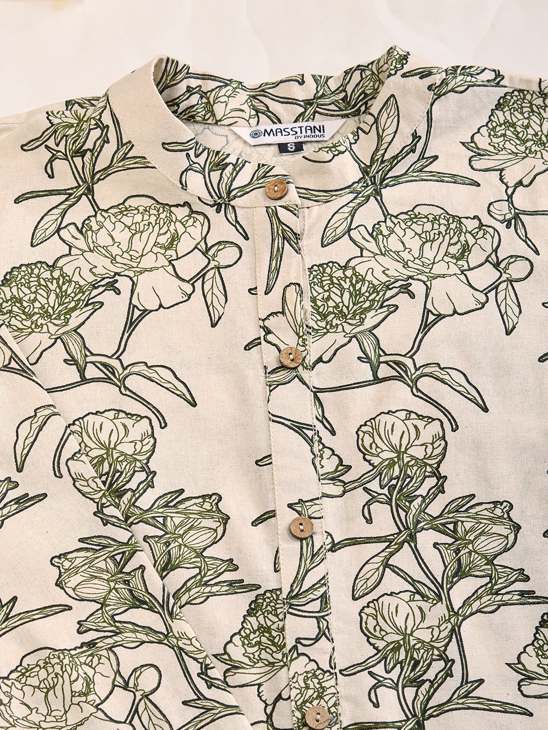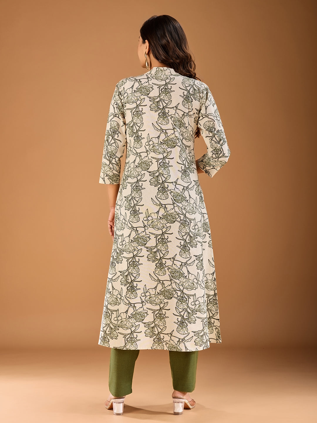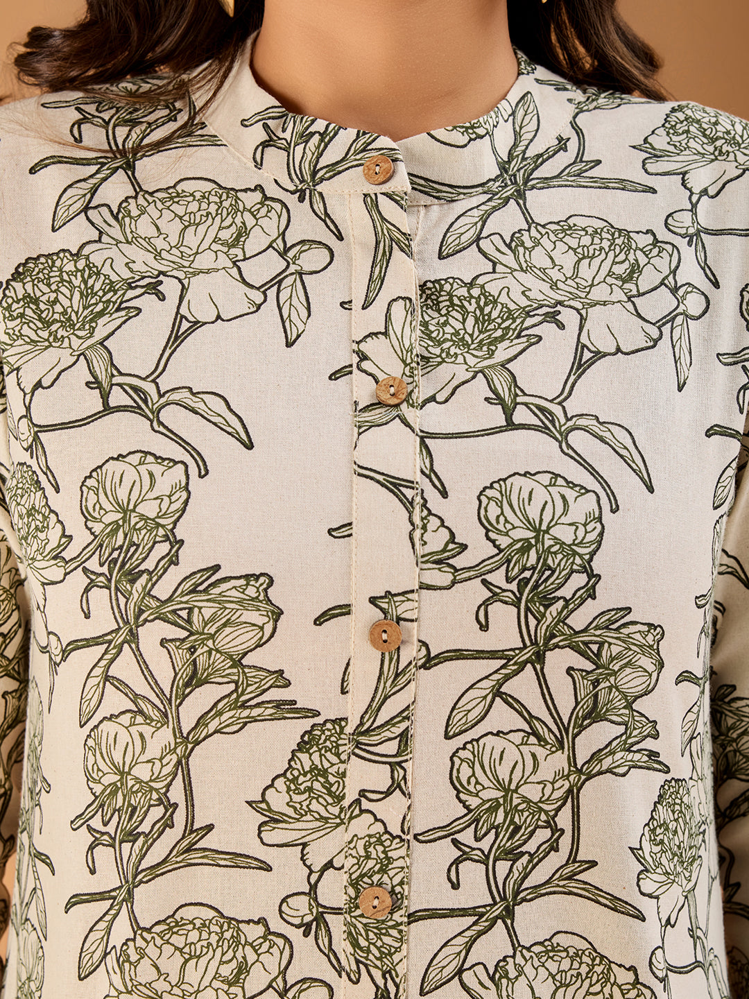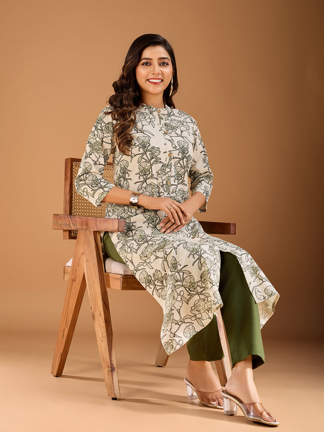 Showcase your feminine grace with our Women's Floral Printed Button Detailed A-Line Kurta. The cream-colored material is adorned with stunning floral prints, while the mandarin collar and three-quarter sleeves add a touch of sophistication. The A-line shape and calf length with flared hem flatter any figure, making this a must-have for any modern woman. Made with high-quality machine-woven regular cotton, this kurta promises both style and comfort.
