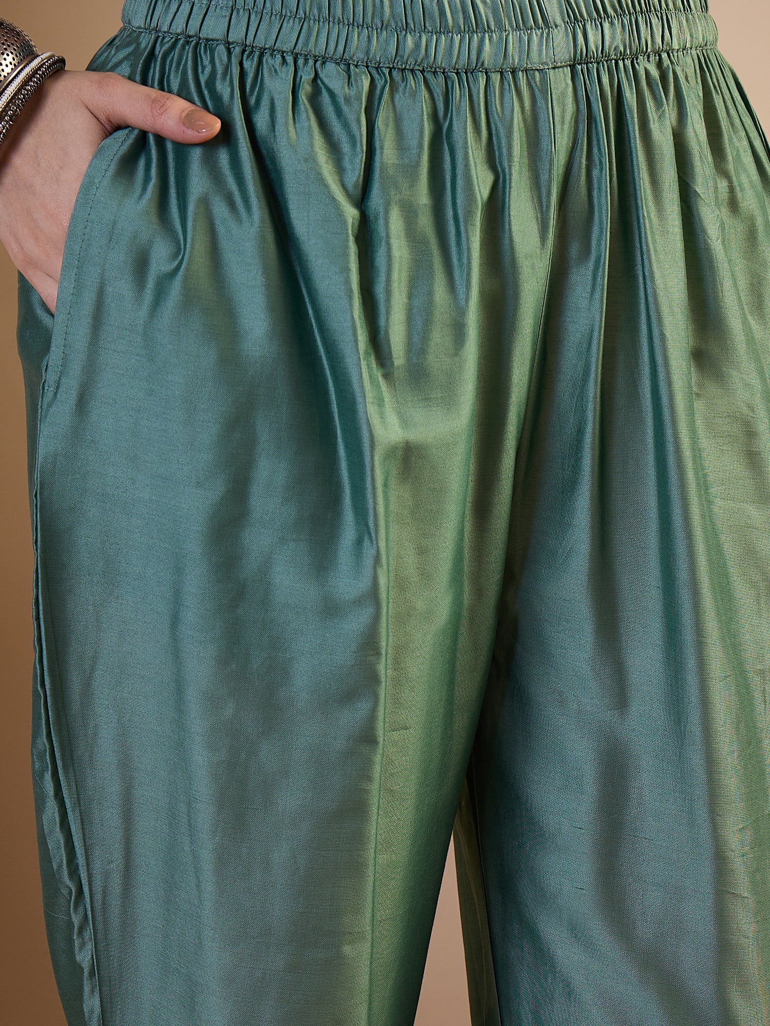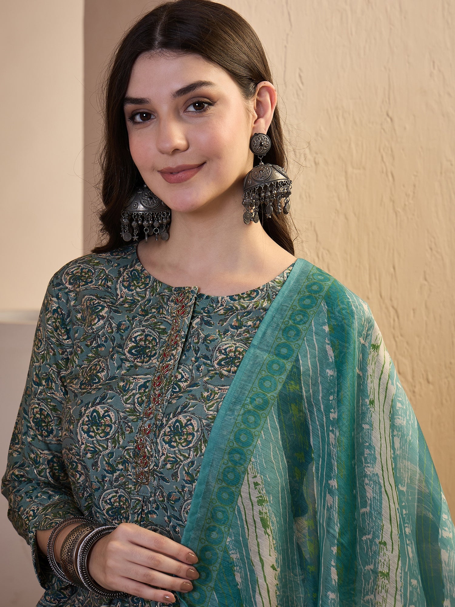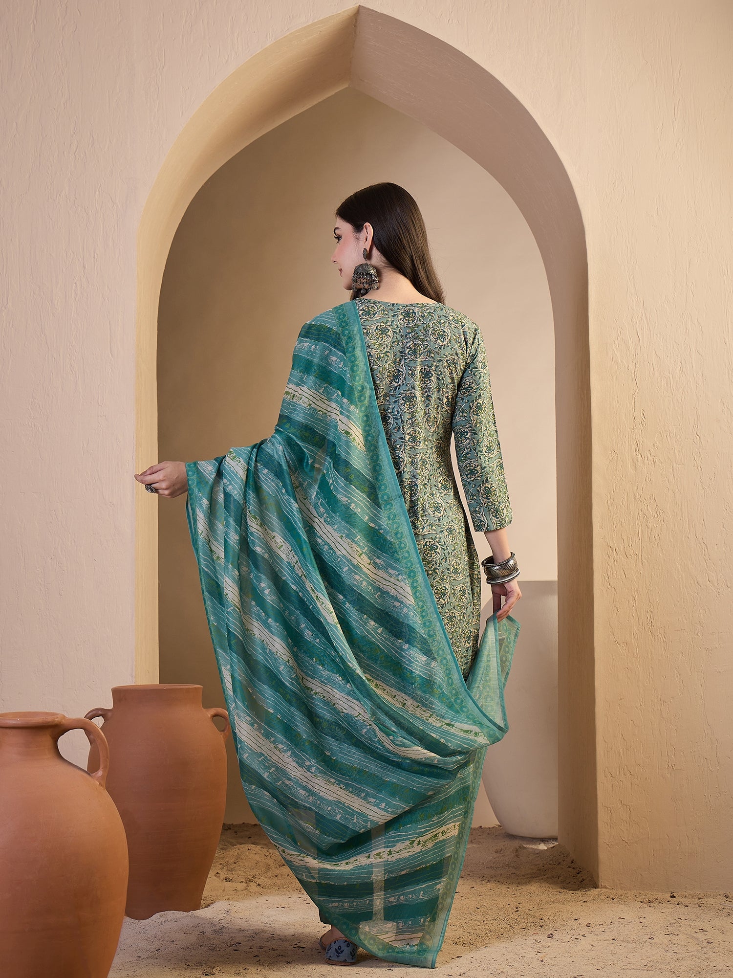 Green printed Top with Trousers with dupatta