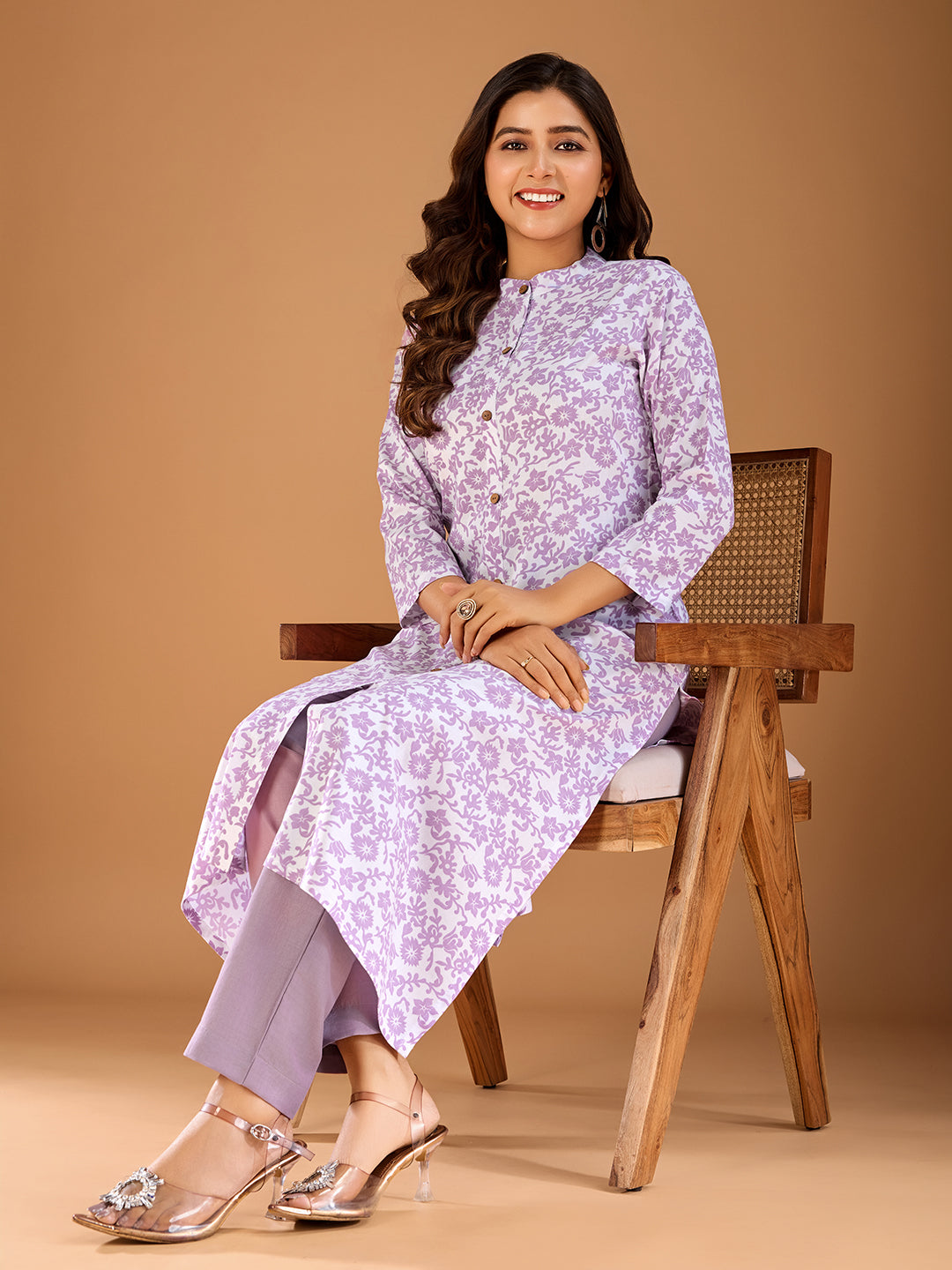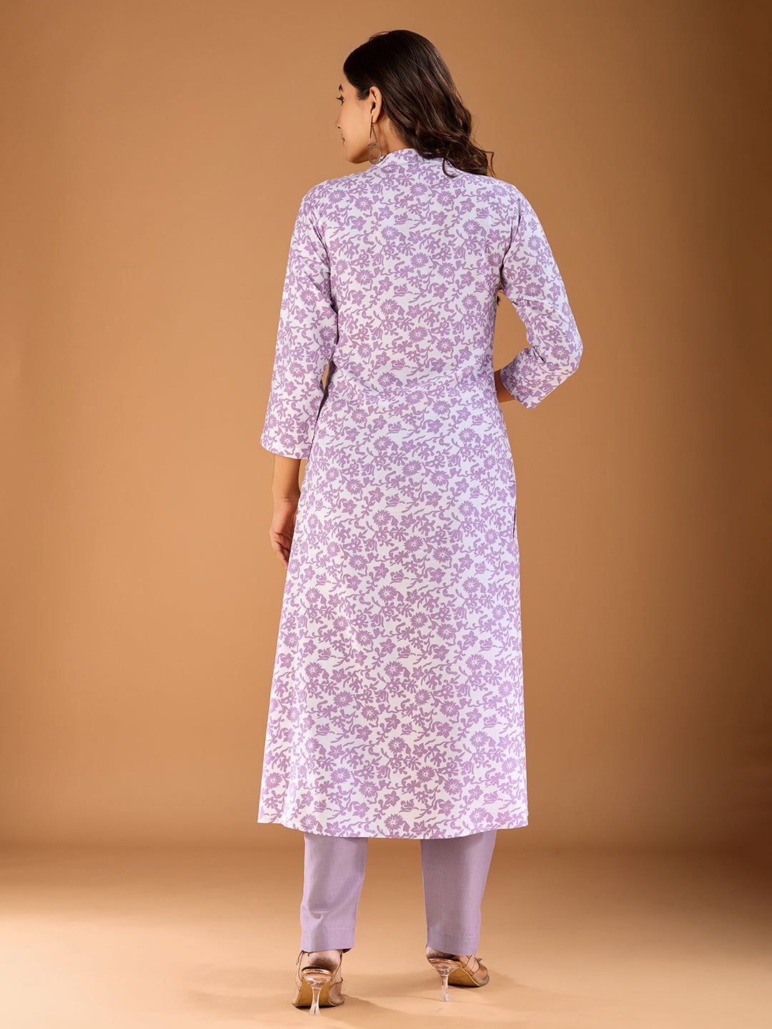 This Women Floral Printed Floral Kurta comes in a charming mauve color and features a mandarin collar and three-quarter, regular sleeves for a stylish look. The A-line shape with a regular style and calf length with a flared hem provide a flattering fit. Made with machine weave regular viscose rayon, this kurta is both comfortable and elegant.