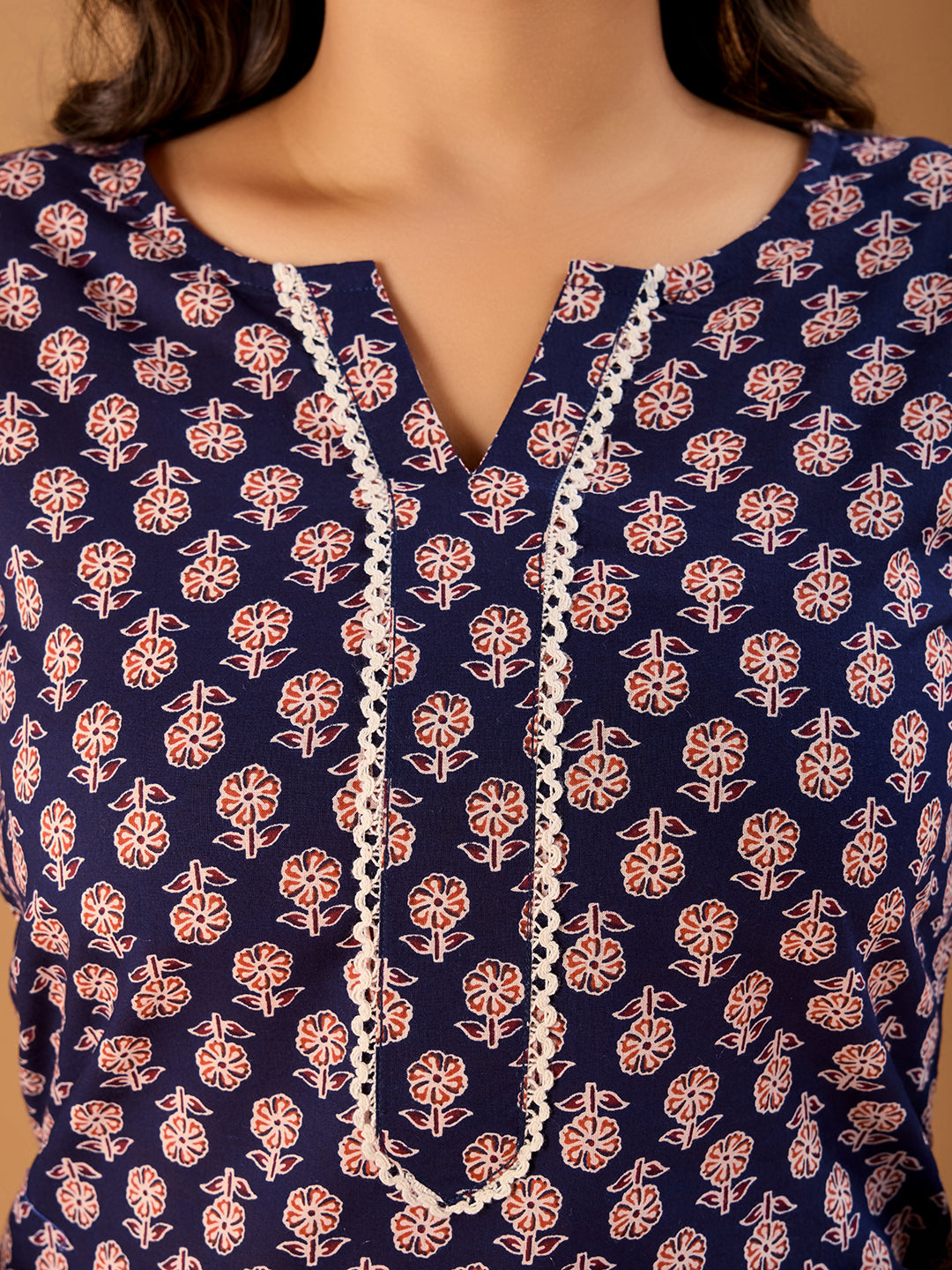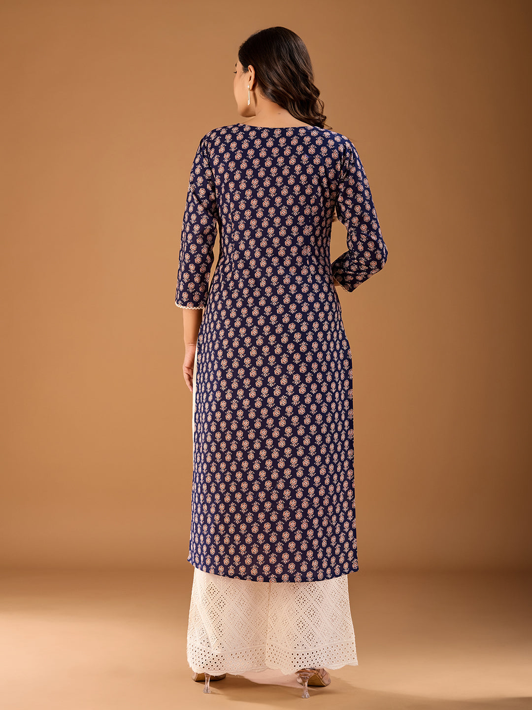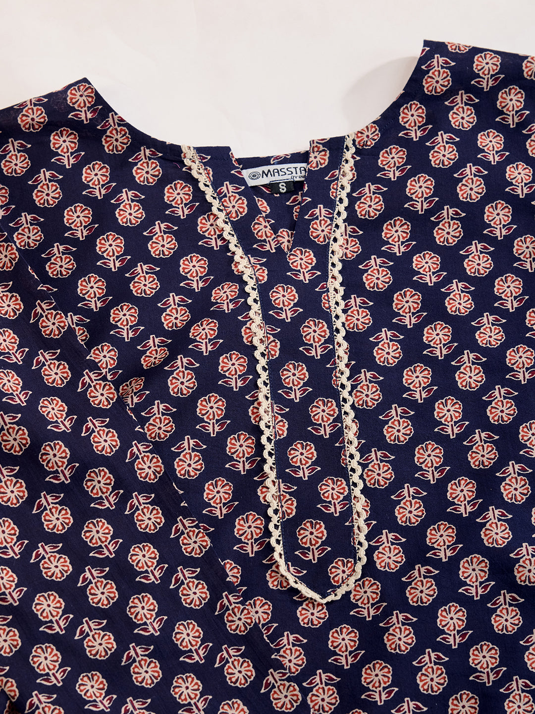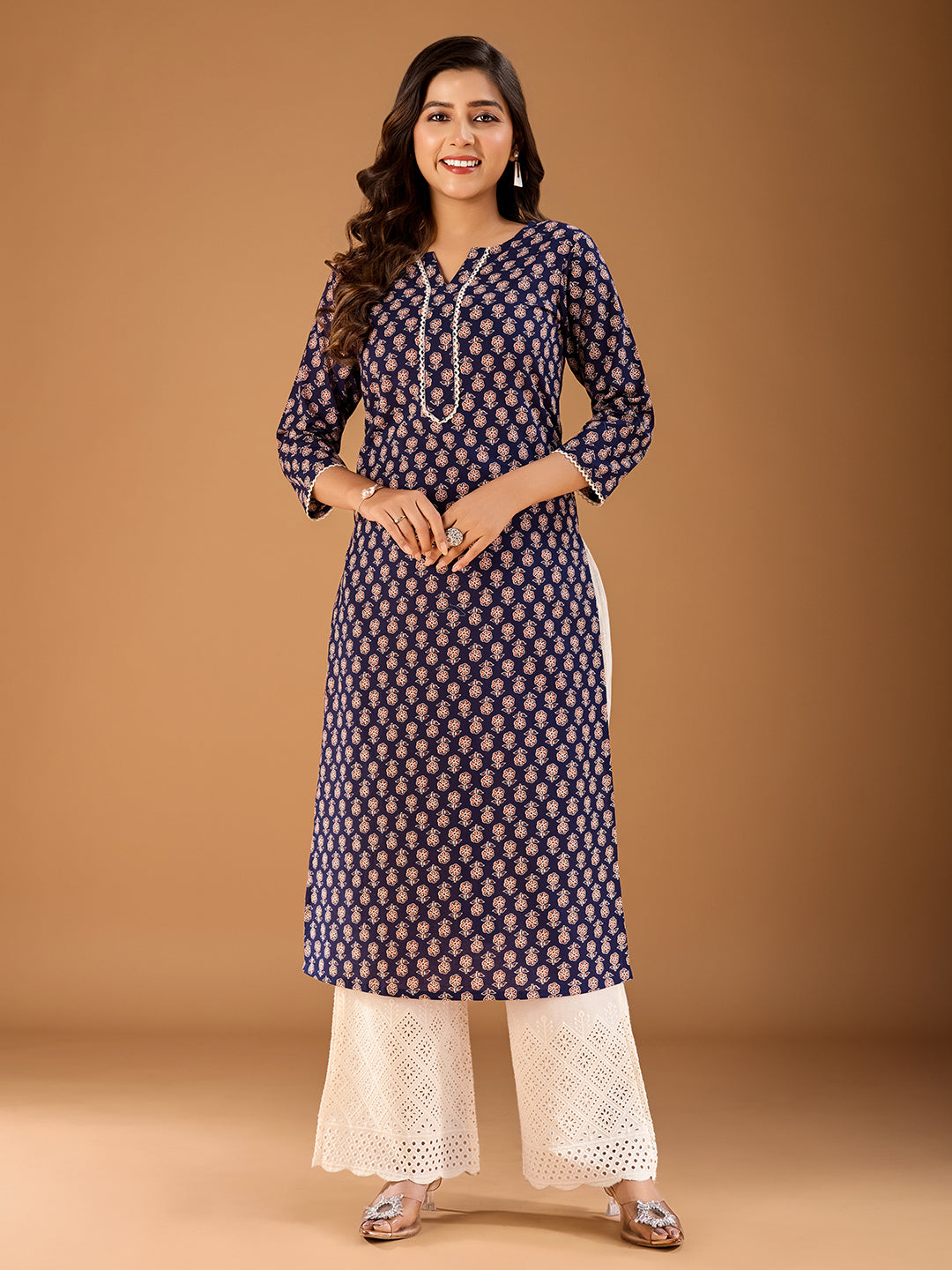 Elevate your style with our Women Floral Printed Gotta Patti Floral Kurta. This purple kurta features a beautiful floral print and a round neck for a classic yet modern look. Its regular three-quarter sleeves and straight shape provide comfort, while the Gotta Patti detailing adds a touch of elegance. Made with machine-woven regular cotton, this calf-length kurta is perfect for any occasion.