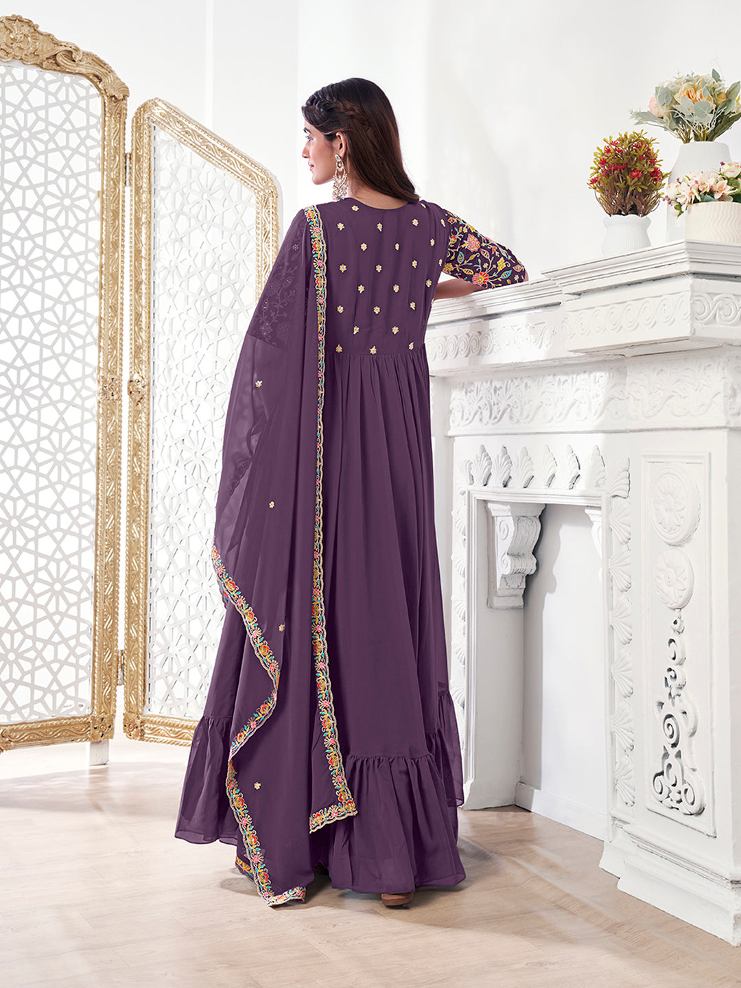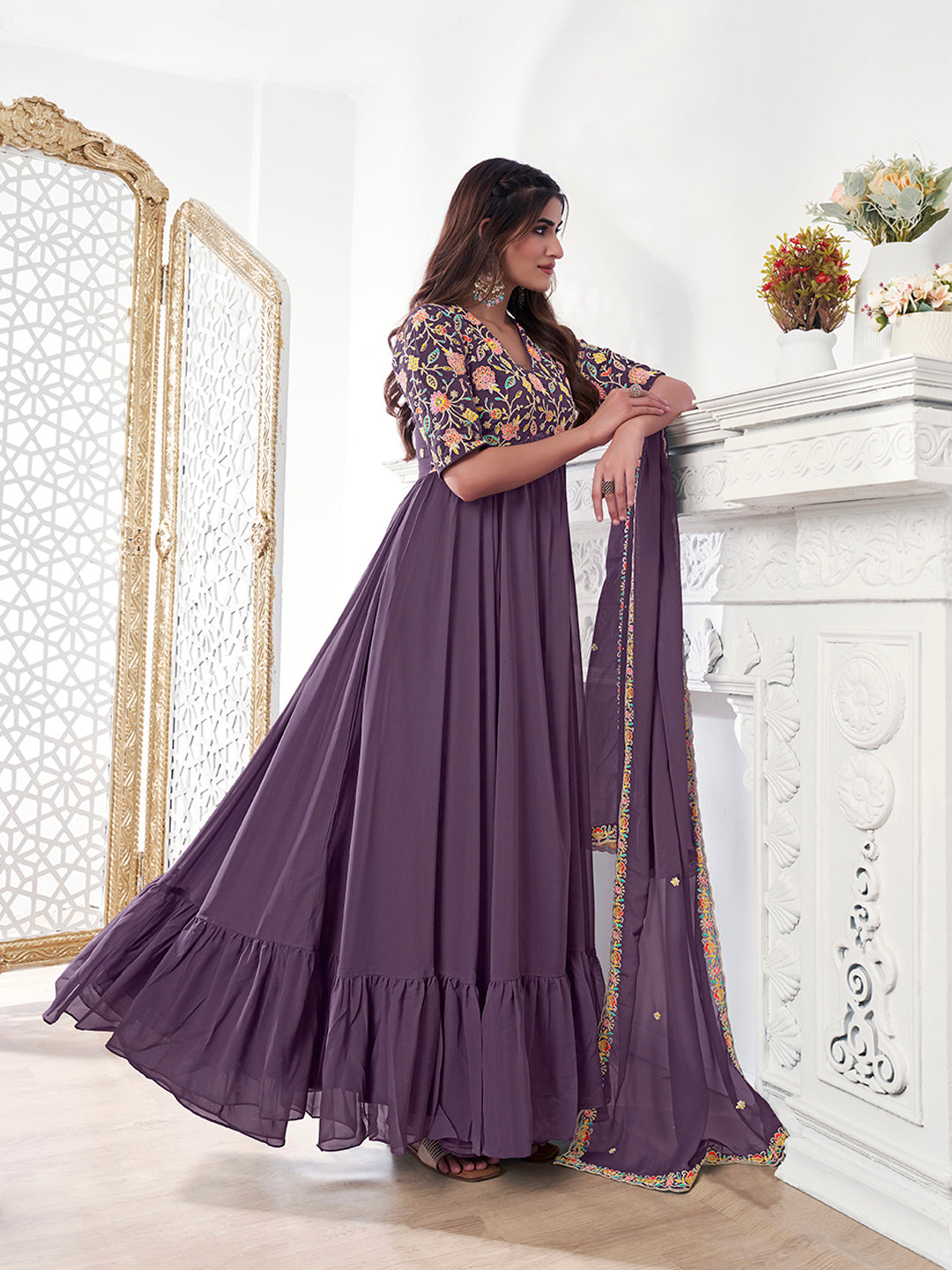 Expertly crafted from lightweight georgette material, this Women Floral Printed Kurta is perfect for any occasion. The mauve color and floral pattern add a touch of elegance, while the mandarin collar and three-quarter sleeves provide a stylish yet modest look. The A-line shape with thread work detail and a flared hem create a flattering empire style. Made with machine-weave georgette, it's both comfortable and easy to care for with dry cleaning.