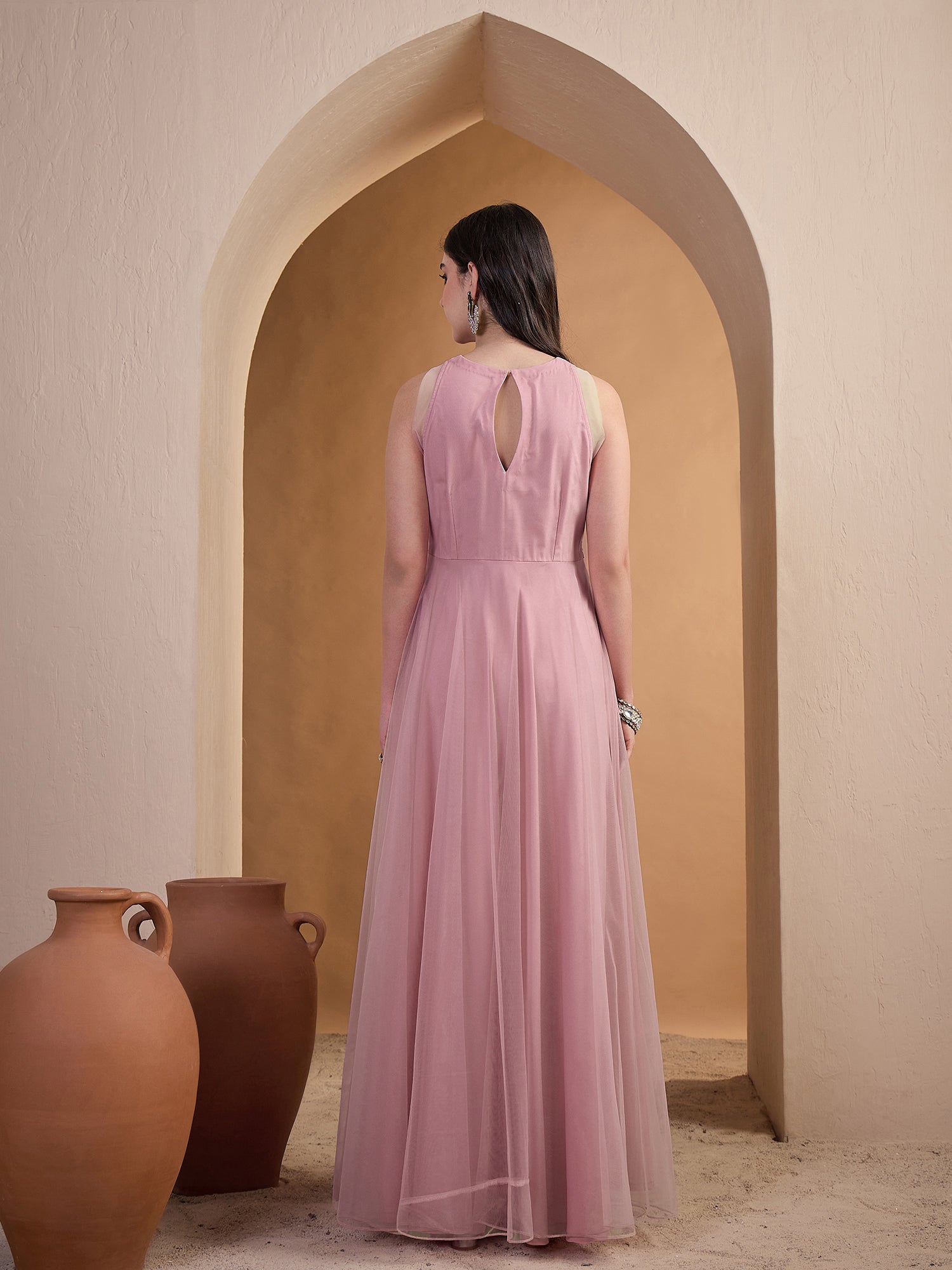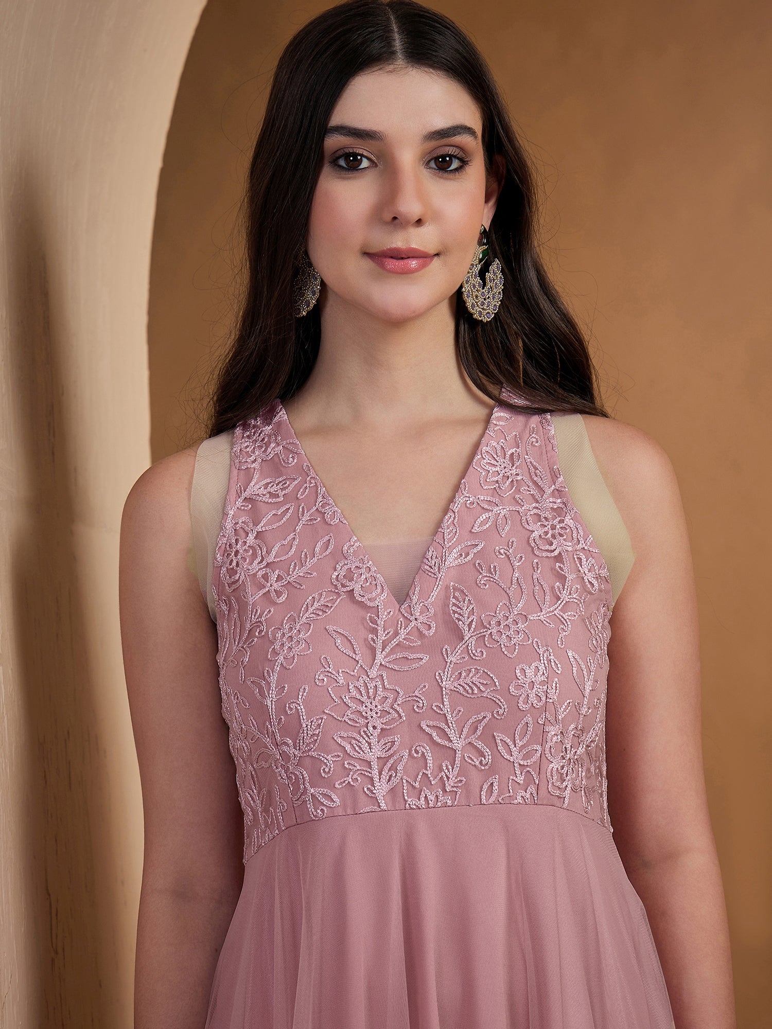 This sophisticated ethnic dress showcases masterful thread embroidery with delicate floral patterns meticulously stitched across the fabric. The sleeveless V-neckline provides a refined, flattering frame, while the empire waistline creates a graceful silhouette that drapes beautifully. The extended length offers versatility for various occasions, from festive celebrations to formal events. Each stitch reflects traditional embroidery techniques, demonstrating exceptional attention to detail and quality craftsmanship. The thoughtful construction ensures comfort without compromising on style. Ideal for discerning customers seeking authentic ethnic wear that combines cultural artistry with contemporary sophistication and wearable elegance.