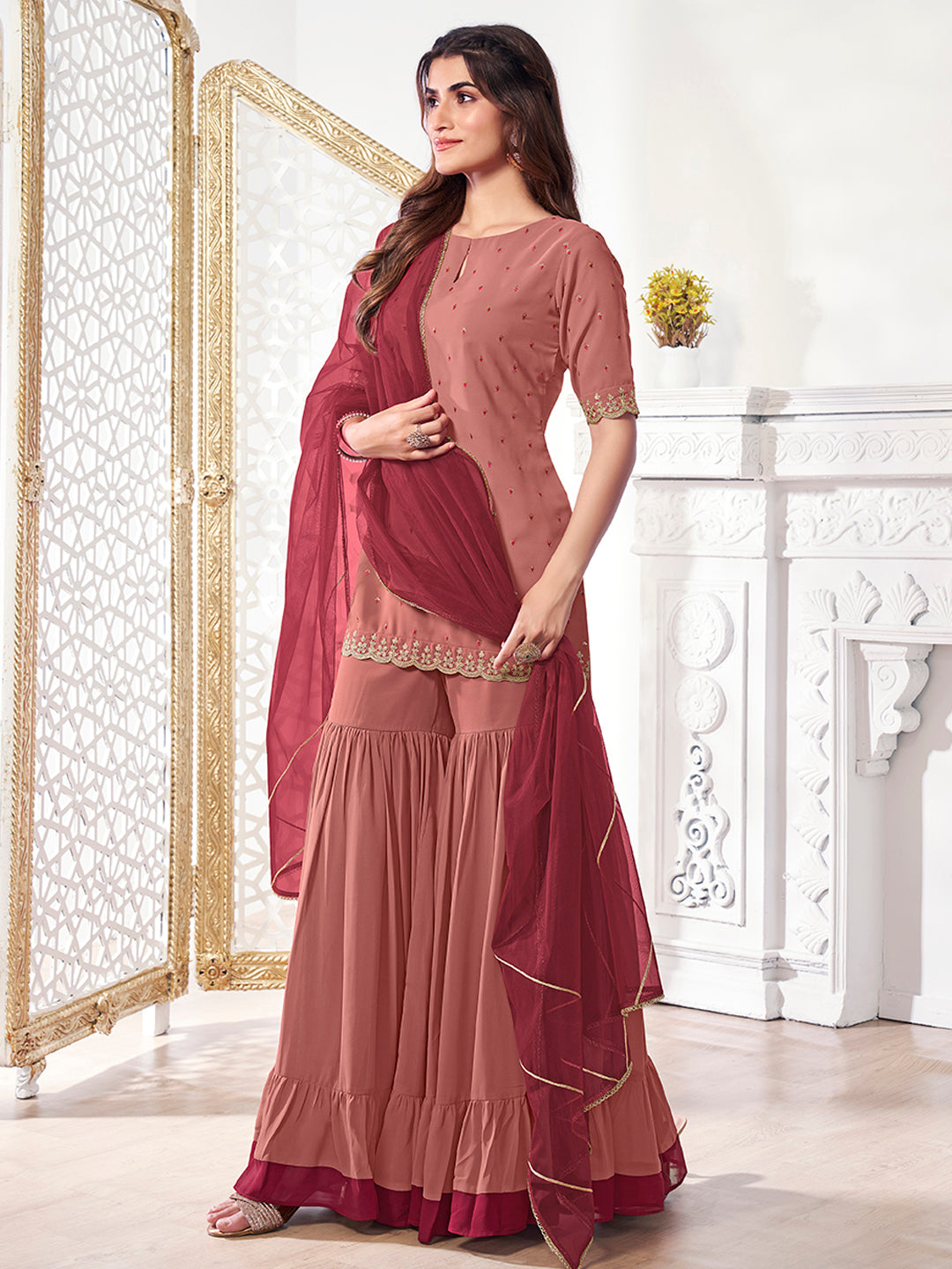 This stunning Women Floral Thread Sequinned Embroidered Kurta, Palazzos, and Dupatta Set in pink is perfect for any occasion. The Kurta features intricate ethnic motifs and sequinned details, while the Sharara offers a comfortable fit with a partially elasticated waistband. Made from high-quality georgette machine weave fabric, this set is sure to impress with its elegant straight shape and scalloped hem. Complete the look with the included dupatta for a polished and elegant outfit.