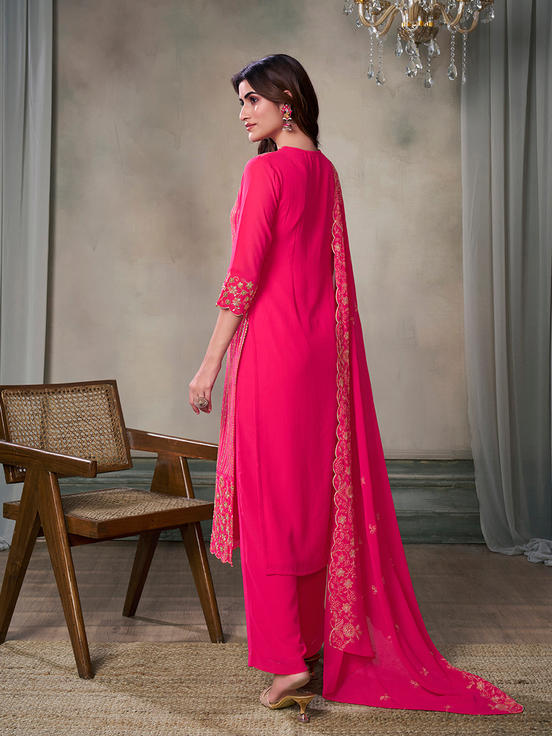 Elevate your traditional wardrobe with our stunning Women Floral Thread Sequinned Embroidered Kurta, Palazzos & Dupatta Set. The kurta features intricate floral embroidery, a round neck and three-quarter sleeves, while the scalloped hem adds a touch of glamour. The palazzos offer comfort with an elastic waistband and slip-on closure. Made from georgette machine weave fabric, this set is perfect for any occasion.
