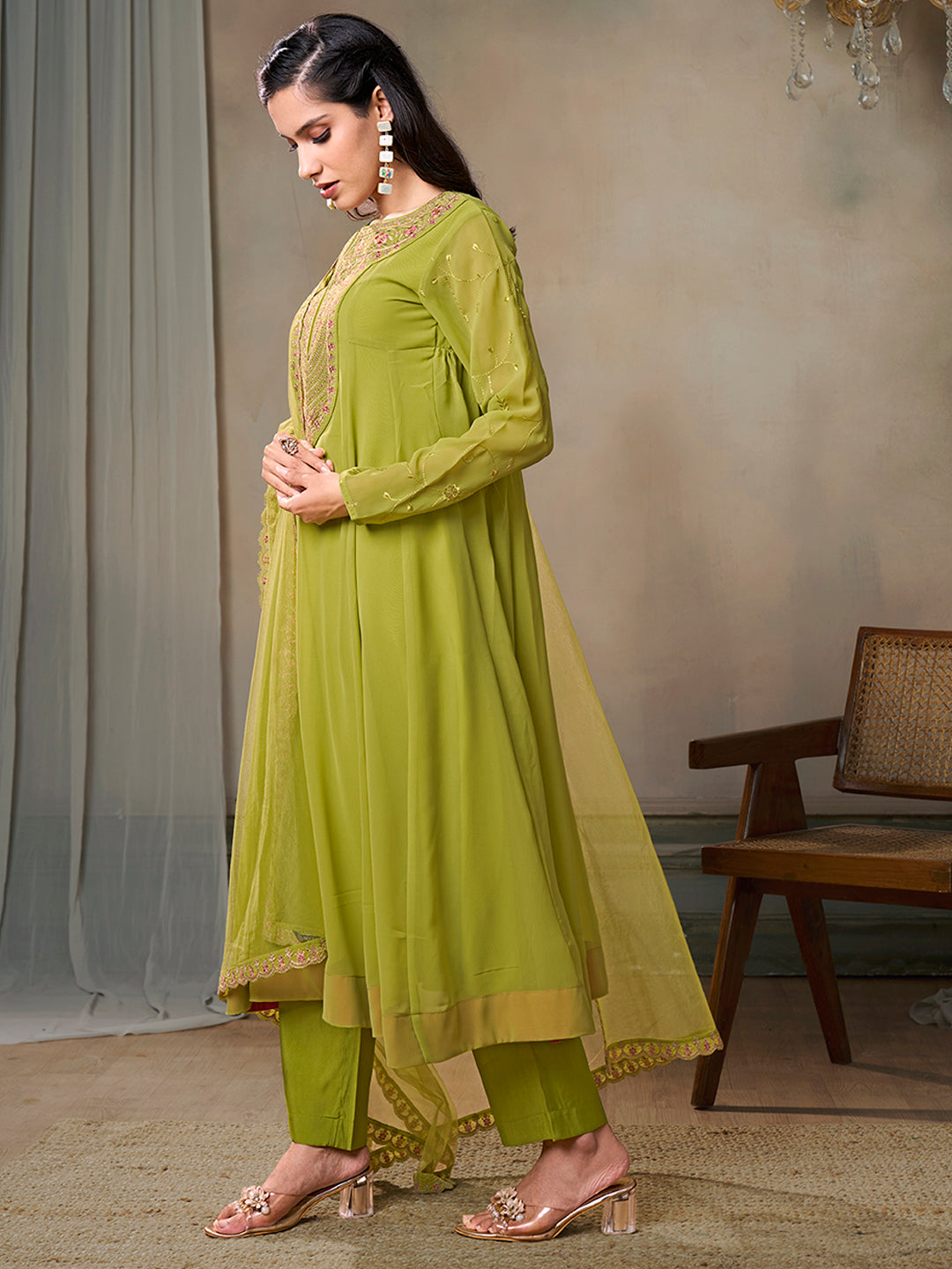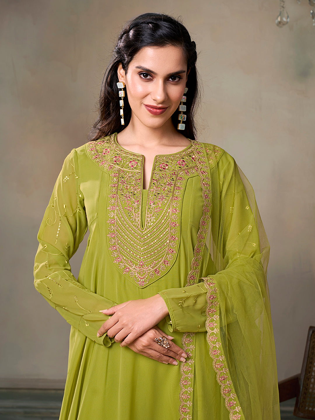 Expertly crafted for the modern woman, this green floral yoke design Kurta is elevated by its A-line shape, panelled style, and round neck with long regular sleeves. The calf length silhouette features a subtle flared hem and intricate zari detailing, while the matching trousers offer comfort with a partially elasticated waistband and slip-on closure. Made from georgette machine weave fabric, this set also includes a dupatta for a complete, elegant look.