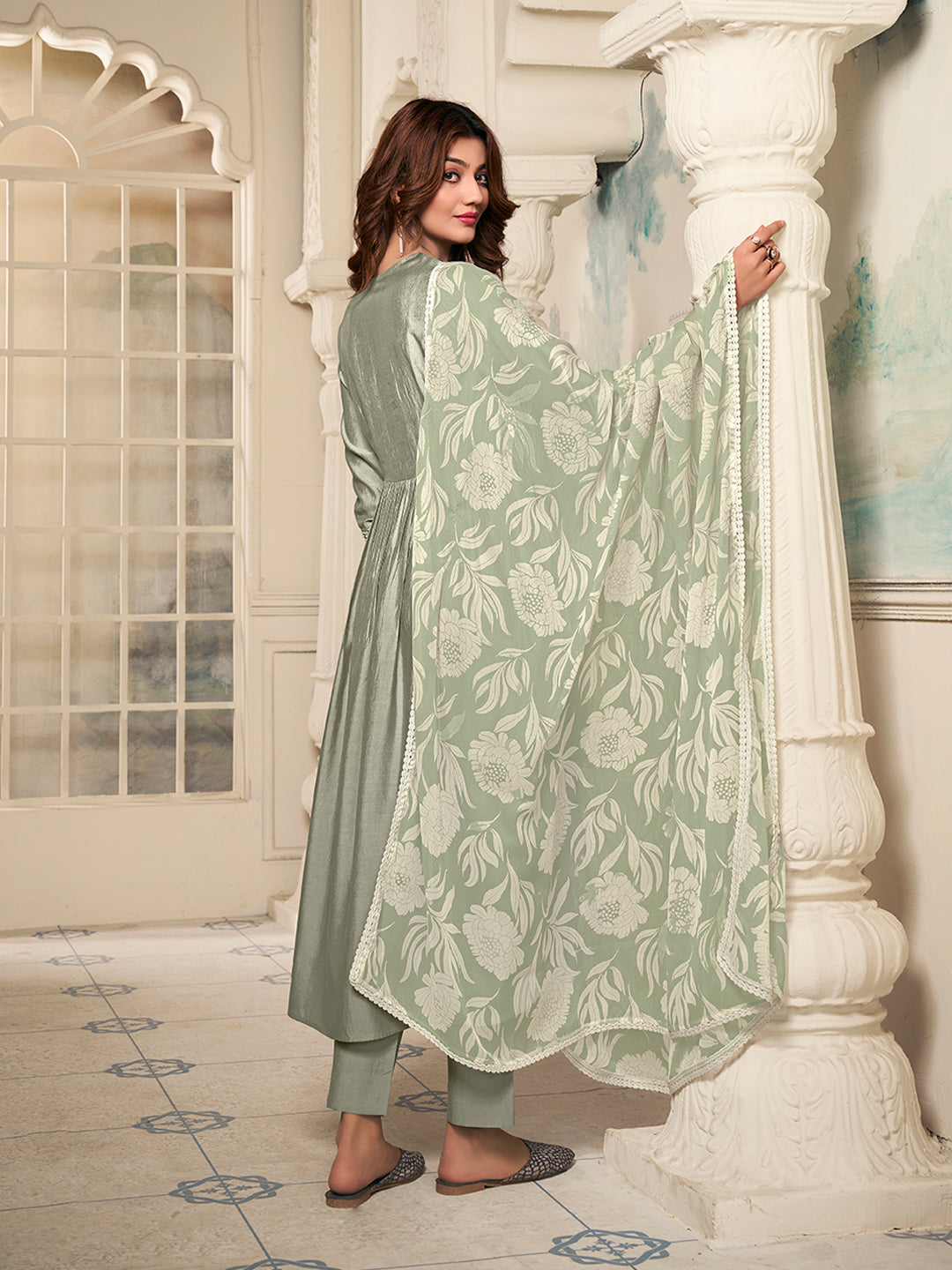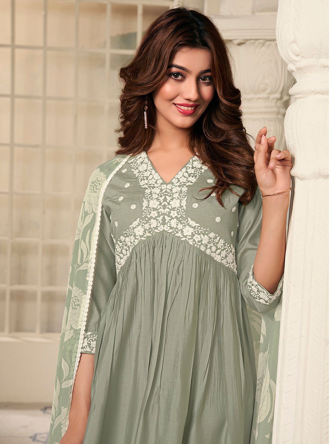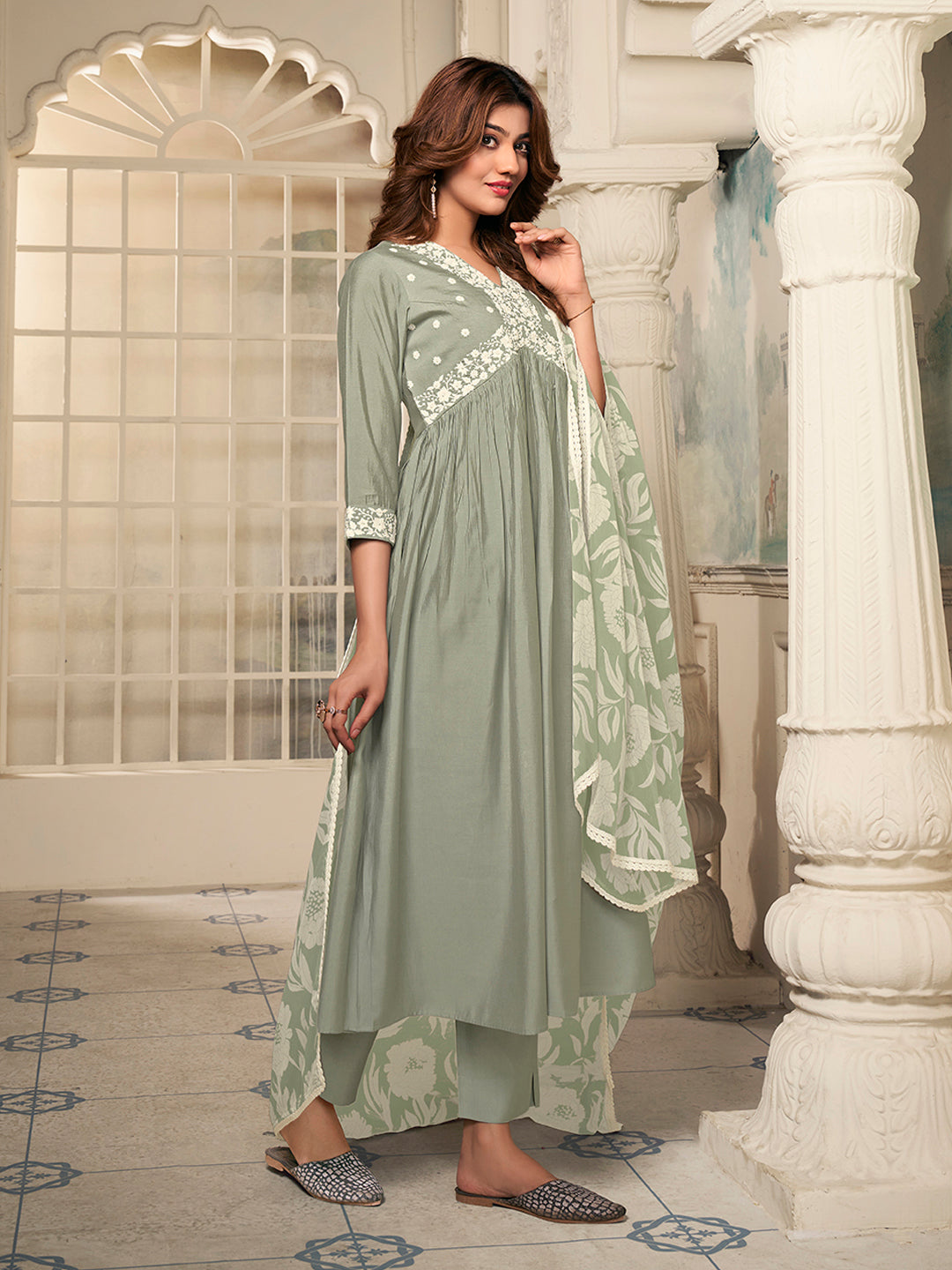 Expertly crafted for those seeking effortless elegance, our Women Floral Yoke Design Pleated Thread Work Kurta with Trousers & With Dupatta features a beautiful anarkali shape with a stunning floral yoke design. The pleated style and V-neck add a touch of sophistication, while the thread work detail and flared hem make a statement. Made from a luxurious silk blend fabric, this set includes solid trousers with a partially elasticated waistband and a matching dupatta. Dry clean only.