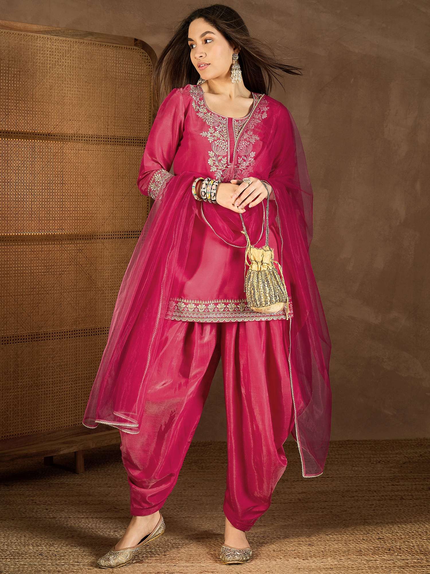 Magenta yoke design Kurta with Dhoti Pants with dupatta