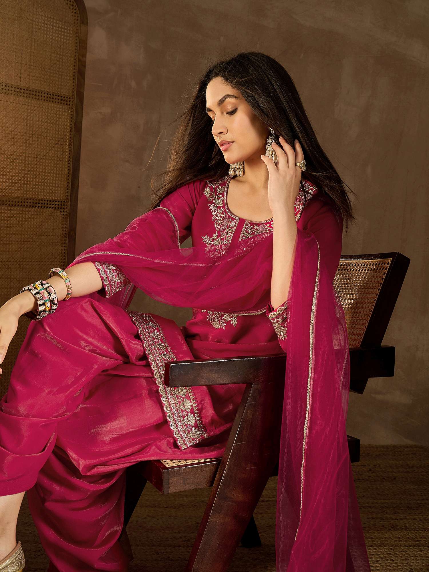 TOP: Viscose Silk Shimmer, TOP INNER: Crepe, BOTTOM: Viscose Silk Shimmer, DUPATTA: Net, Dry Clean