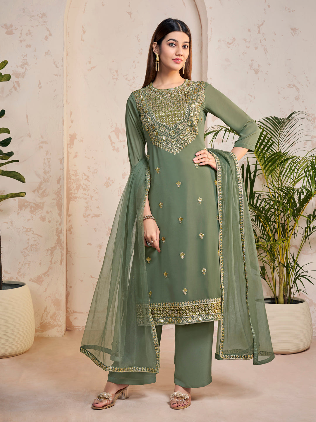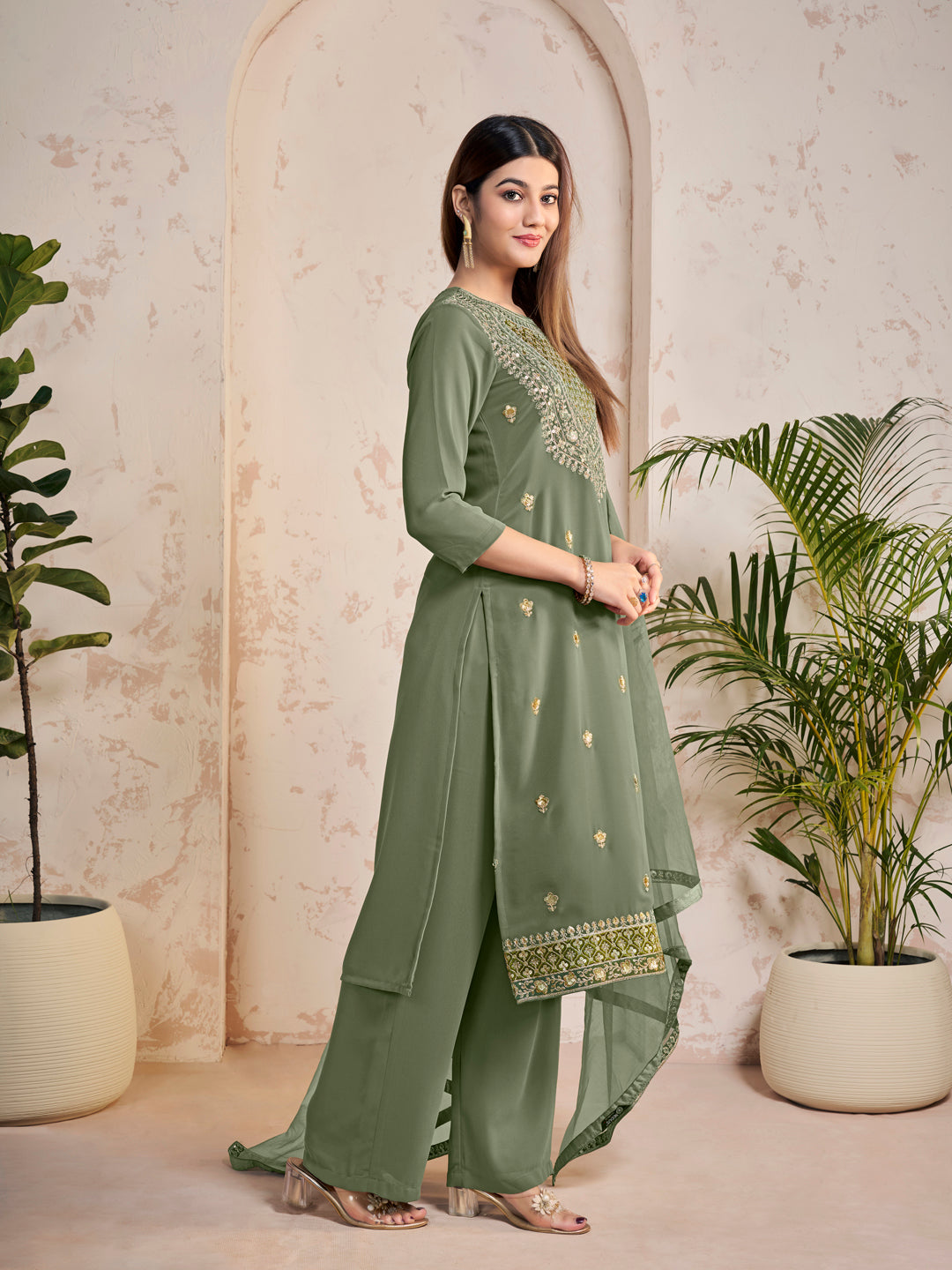Green yoke design Kurta with Palazzos with dupatta