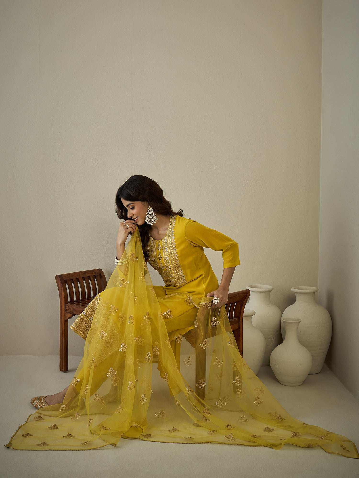 Get ready to turn heads with our women's floral yoke kurta paired with trousers and a matching dupatta. The kurta features a beautiful floral design with sequinned detailing, while the trousers have a solid color and a partially elasticated waistband for comfort. Made from high-quality georgette fabric, this set is perfect for any occasion.