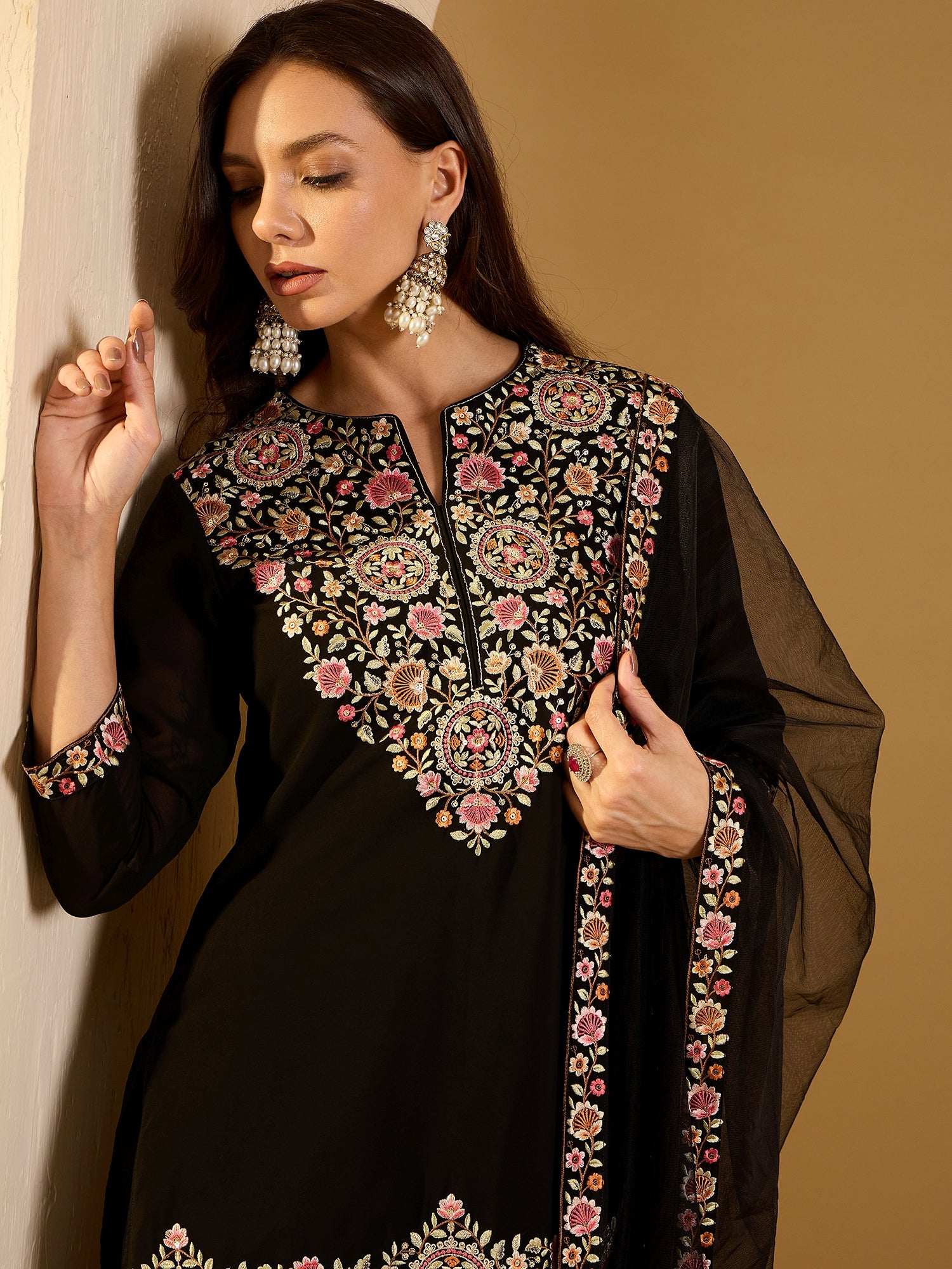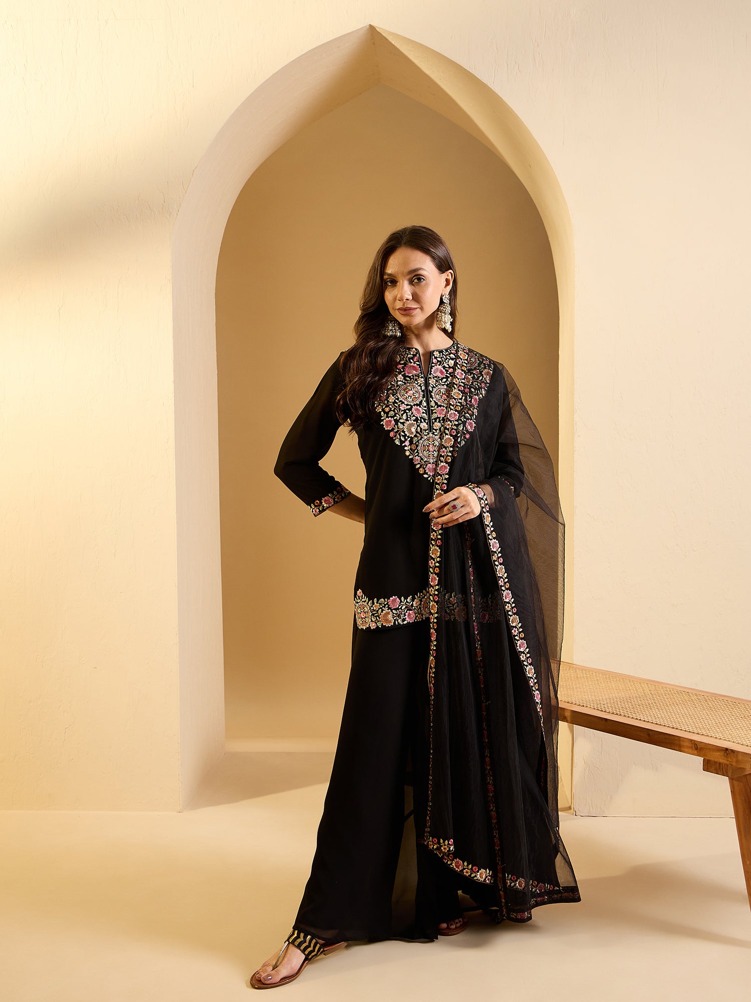 Upgrade your ethnic wardrobe with this elegant Women Floral Yoke Design Regular Kurta. The black kurta with floral yoke design, paired with solid palazzos and dupatta, exudes a modern yet traditional look. Made with high-quality georgette fabric and featuring thread work detail, this outfit offers comfort and style. Perfect for any occasion!