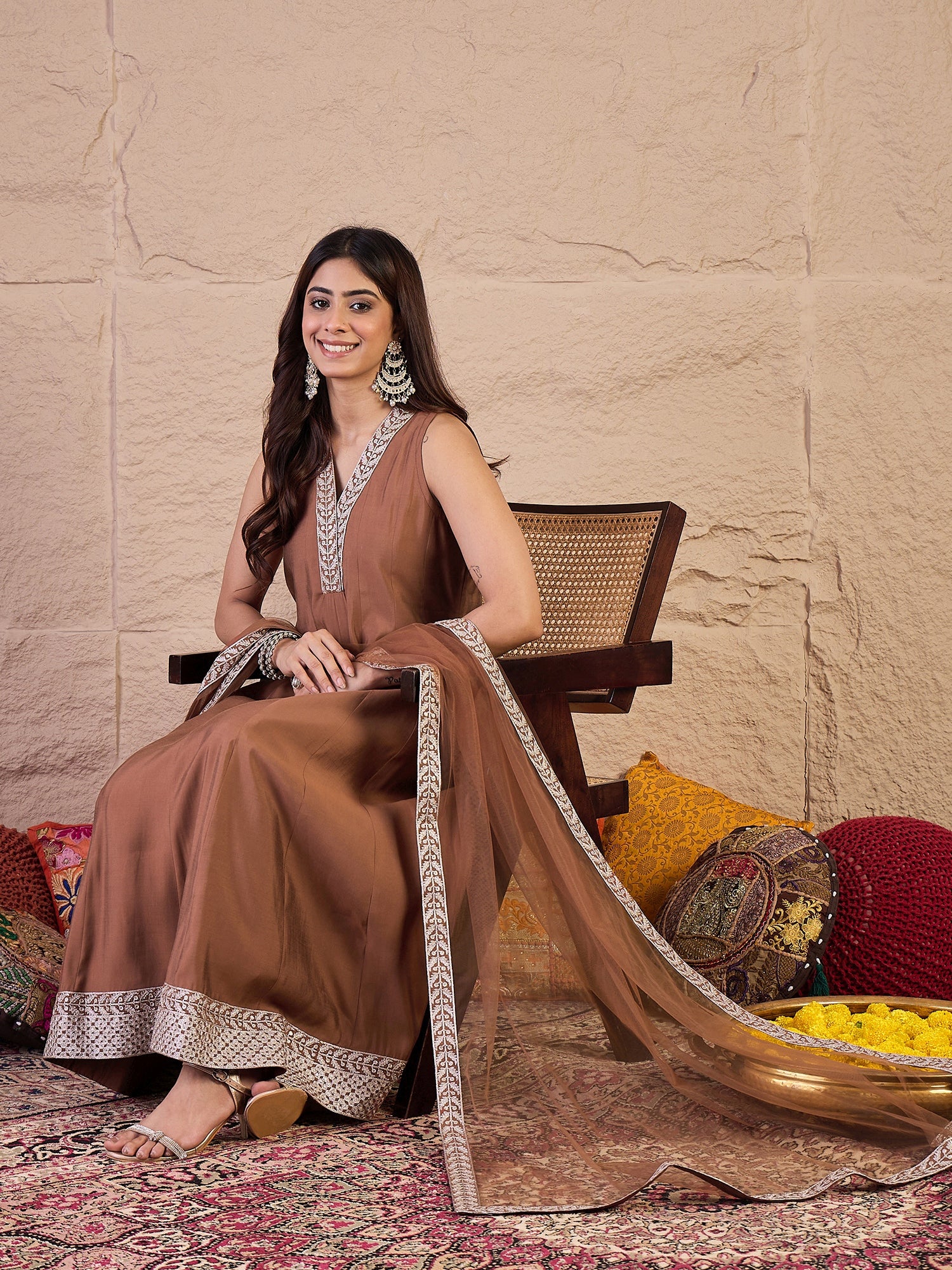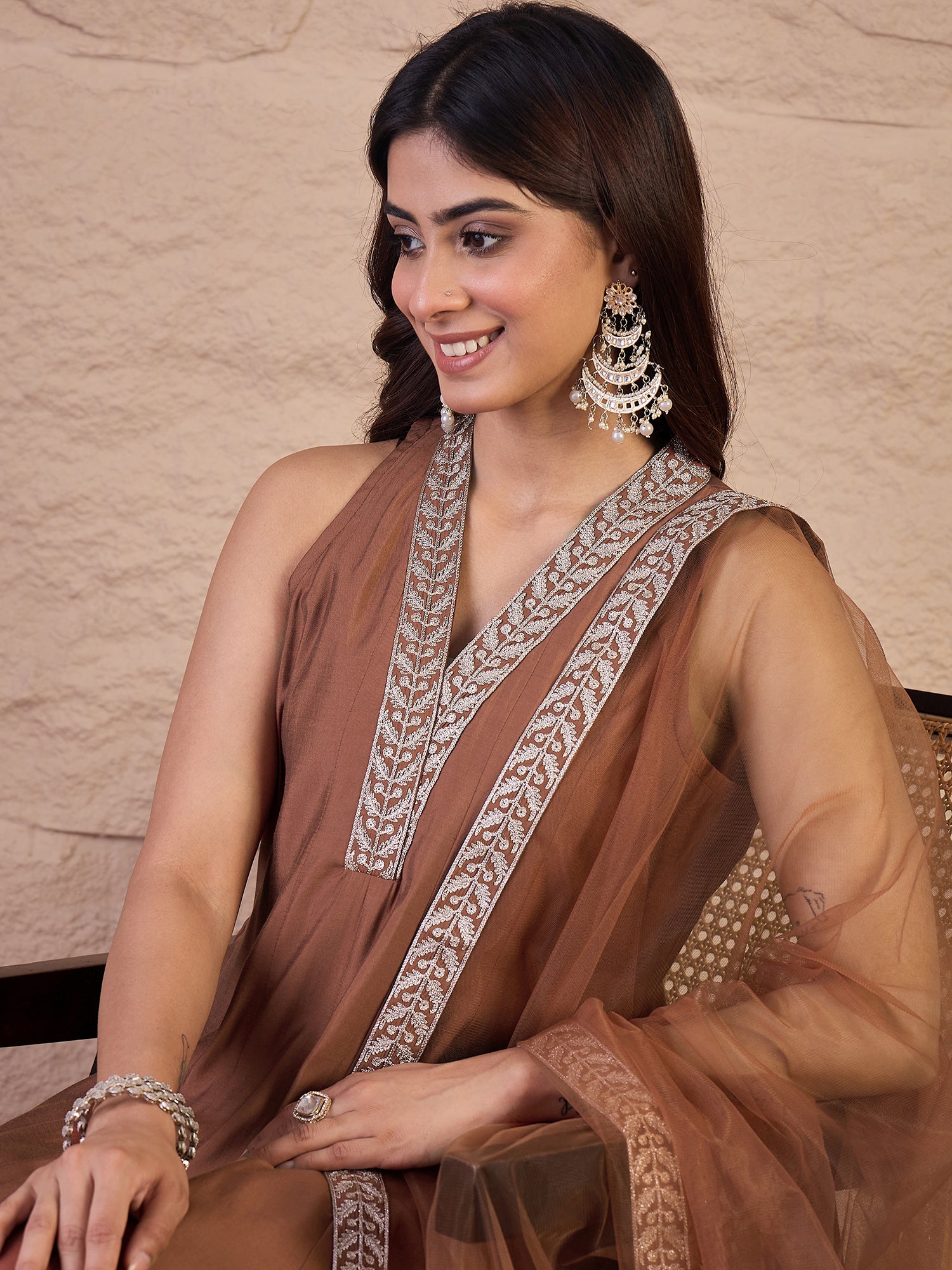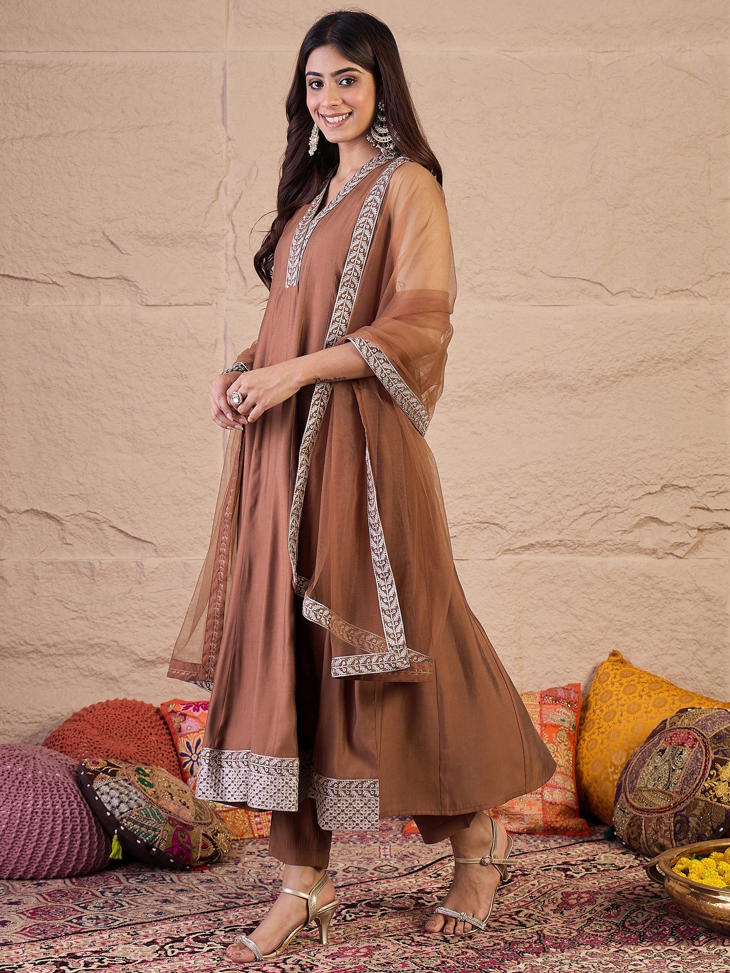 Brown yoke design Kurta with Trousers with dupatta