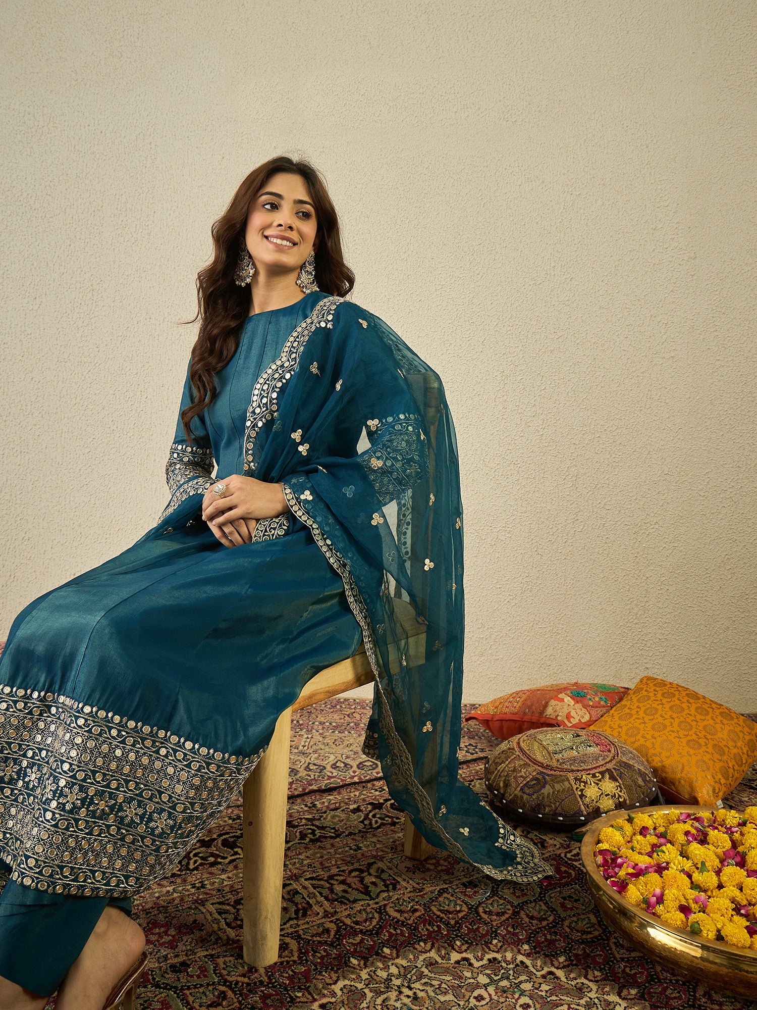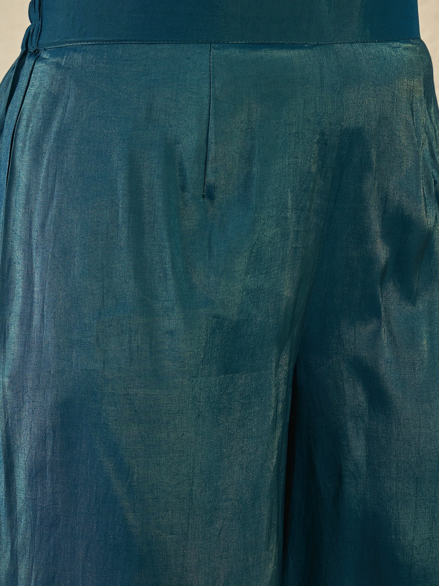 Teal and gold-toned yoke design Kurta with Palazzos with dupatta