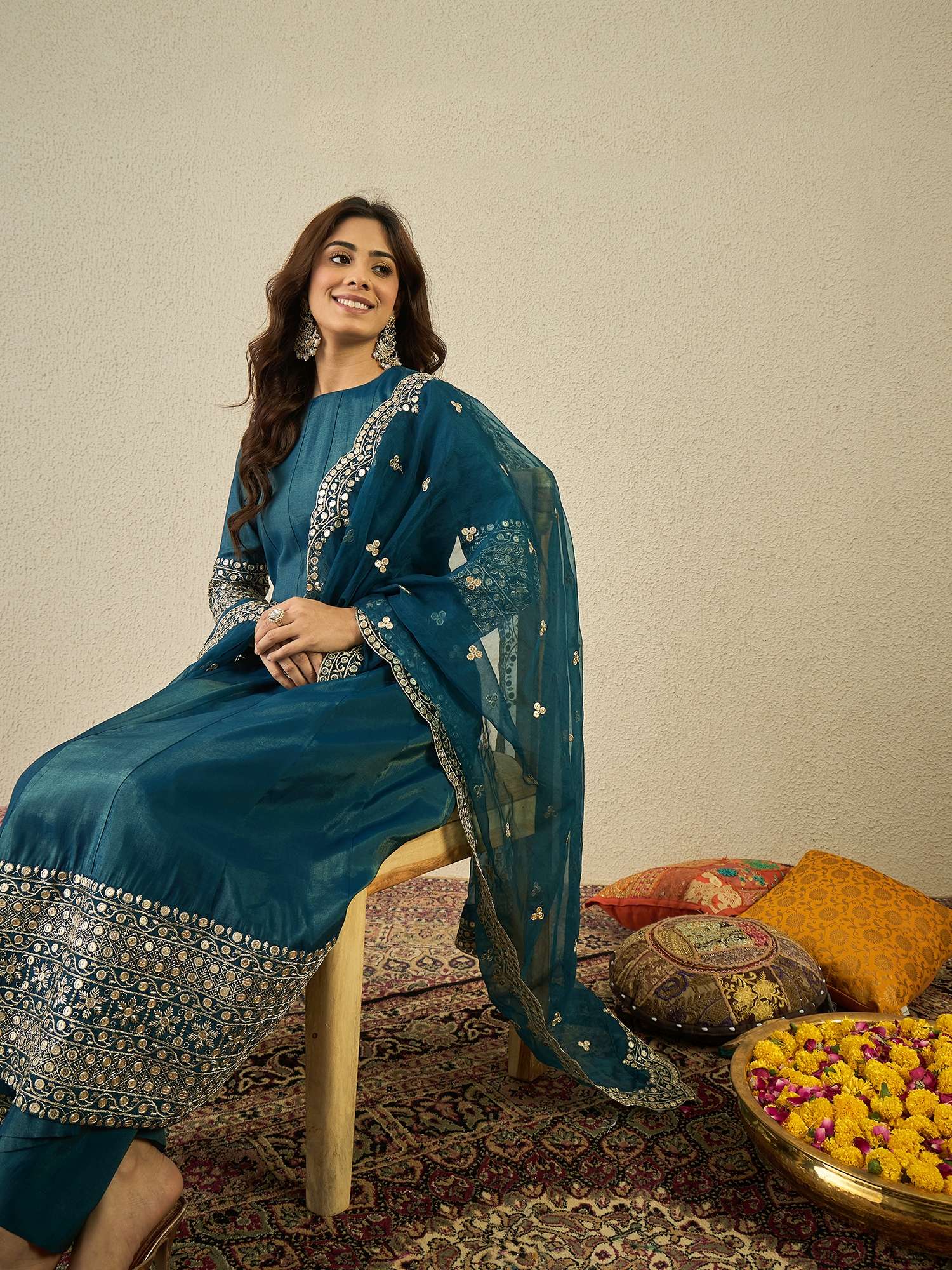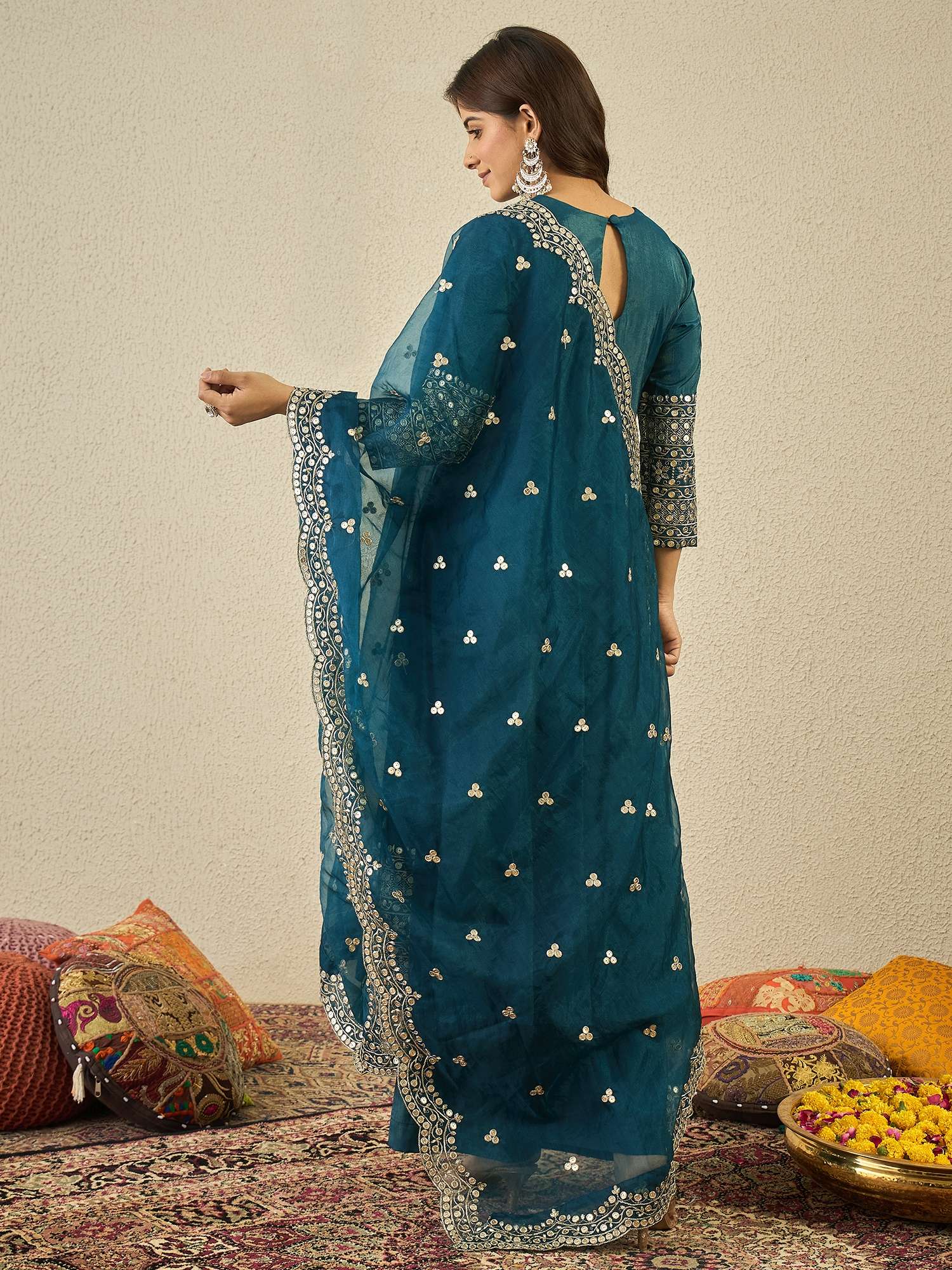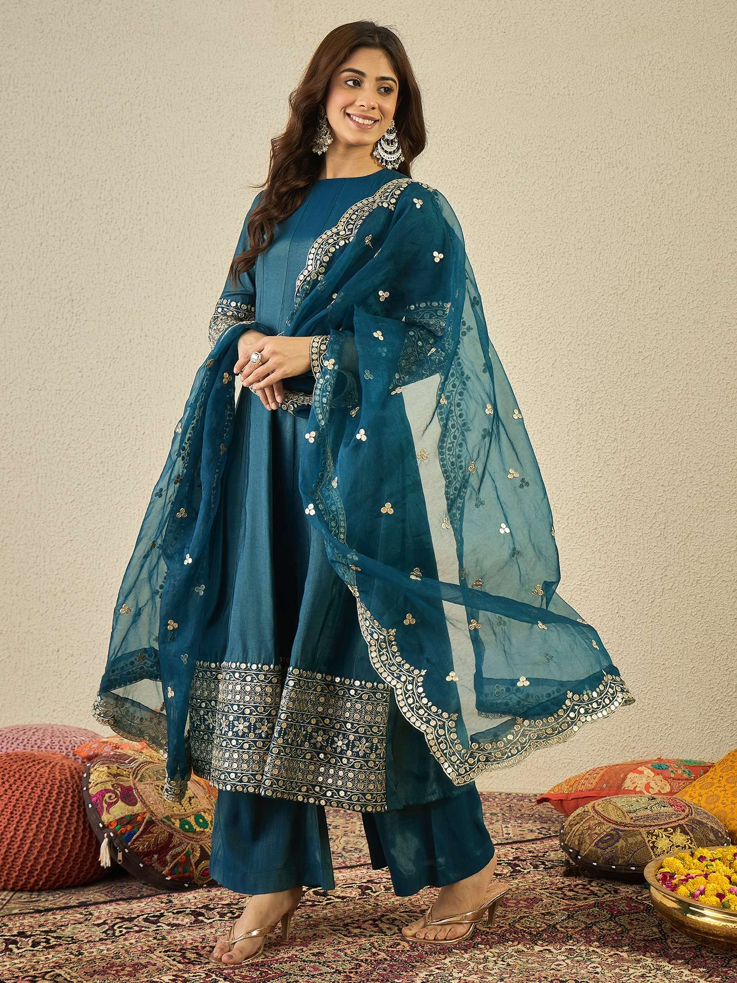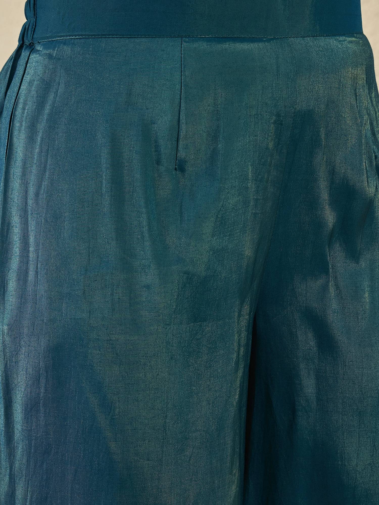 Teal and gold-toned yoke design Kurta with Palazzos with dupatta Kurta design: Floral yoke design Anarkali shape Regular style Round neck, three-quarter regular sleeves Sequinned detail Calf length with flared hem Silk blend machine weave fabric Palazzos design: Solid Palazzos Partially elasticated waistband Slip-on closure Dupatta design: Embroidered dupatta Taping border Size & Fit The model (height 5'8) is wearing a size S Material & Care Kurta Fabric: Silk Blend Bottom Fabric: Silk Blend Dupatta Fabric: Organza Dry Clean