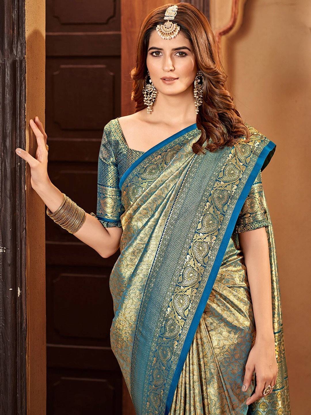 This Women Gold Zari Woven Traditional Saree is a perfect blend of elegance and tradition. The exquisite zari weaving and ethnic motive border add a touch of sophistication to your wardrobe. Made with high-quality materials, this saree offers comfort and durability. Elevate your style with this timeless piece.