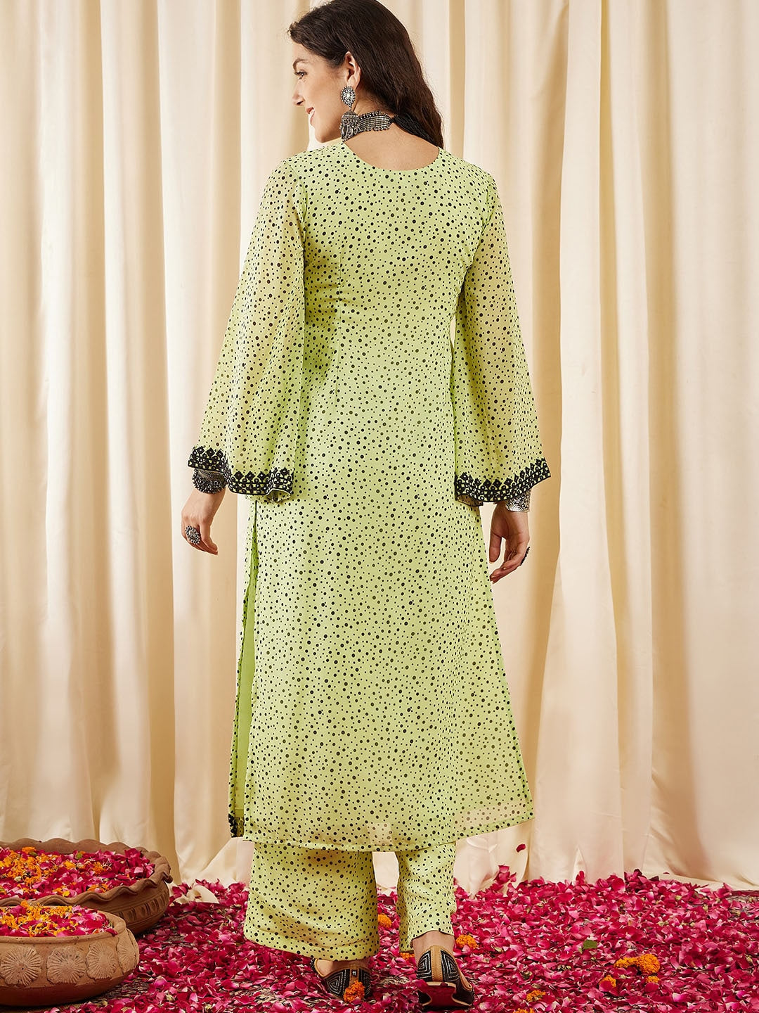 Crafted from poly georgette using machine weave, this Women Green Printed Regular Kurta with Palazzos offers a straight shape for a flattering fit. The geometric print design adds a touch of modern flair. The round neck and long flared sleeves enhance the regular style while the slip-on closure and partially elasticated waistband make for a comfortable wear. With thread work detail on the pockets and a calf length straight hem, this kurta with palazzos is perfect for any occasion.