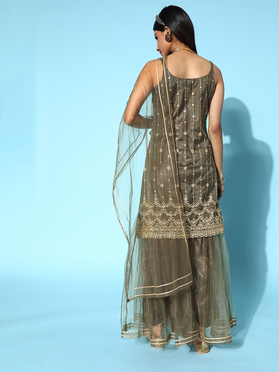 This Green Striped Net Bling it On Kurta Set is the perfect choice for those looking to make a statement. Enjoy the striking round neck and above knee length of this voguish set. The stunning green shade and solid pattern paired with the flowy net material is sure to turn heads. Dry clean only.