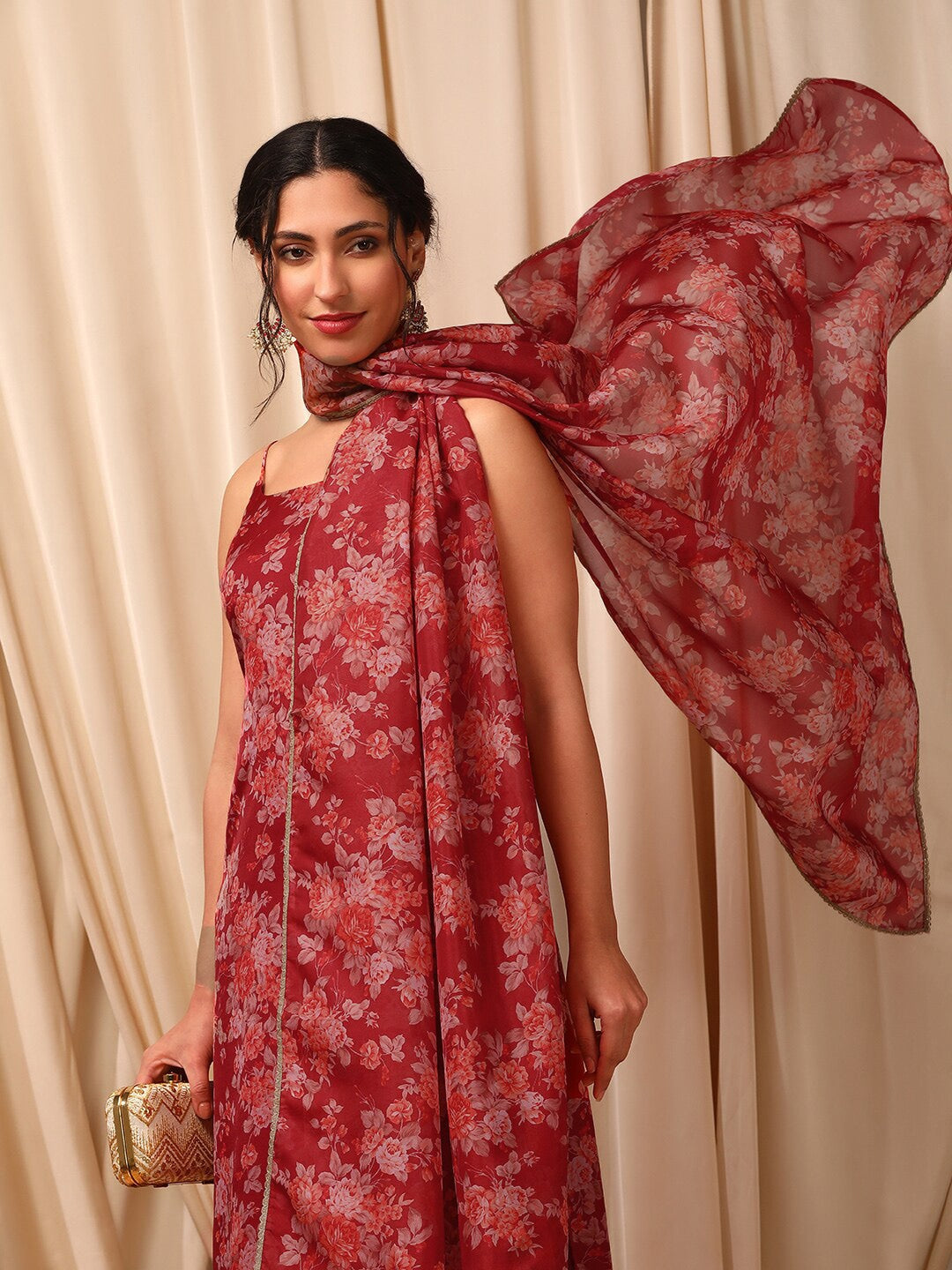 This Maroon Floral Printed Regular Kurta with Trousers & With Dupatta is ideal for the modern woman who wants to make a statement. The kurta features a beautiful floral print, a straight shape, and shoulder straps for a flattering fit. Made from organza machine weave fabric, it offers a crisp and elegant look. The trousers are solid and have a partially elasticated waistband for comfort and ease of wear. With a slip-on closure, it is convenient and stylish for any occasion. Elevate your wardrobe with this must-have ensemble.