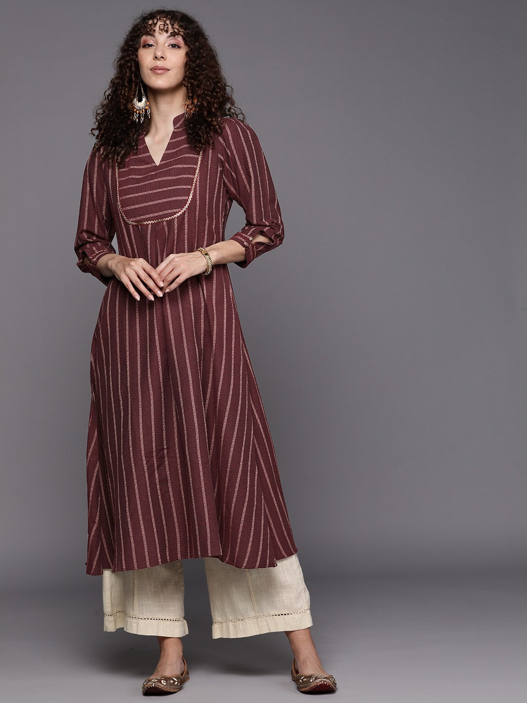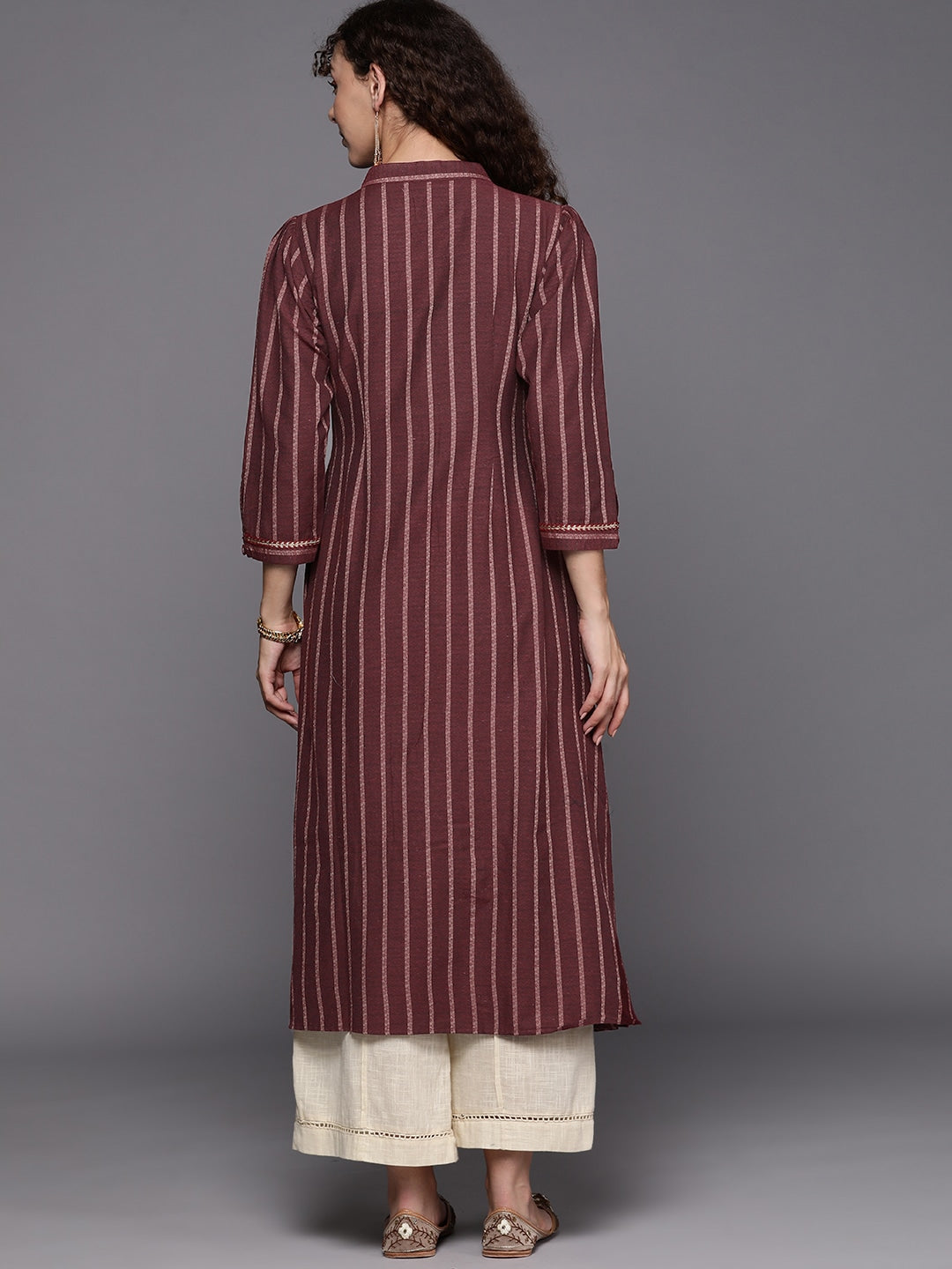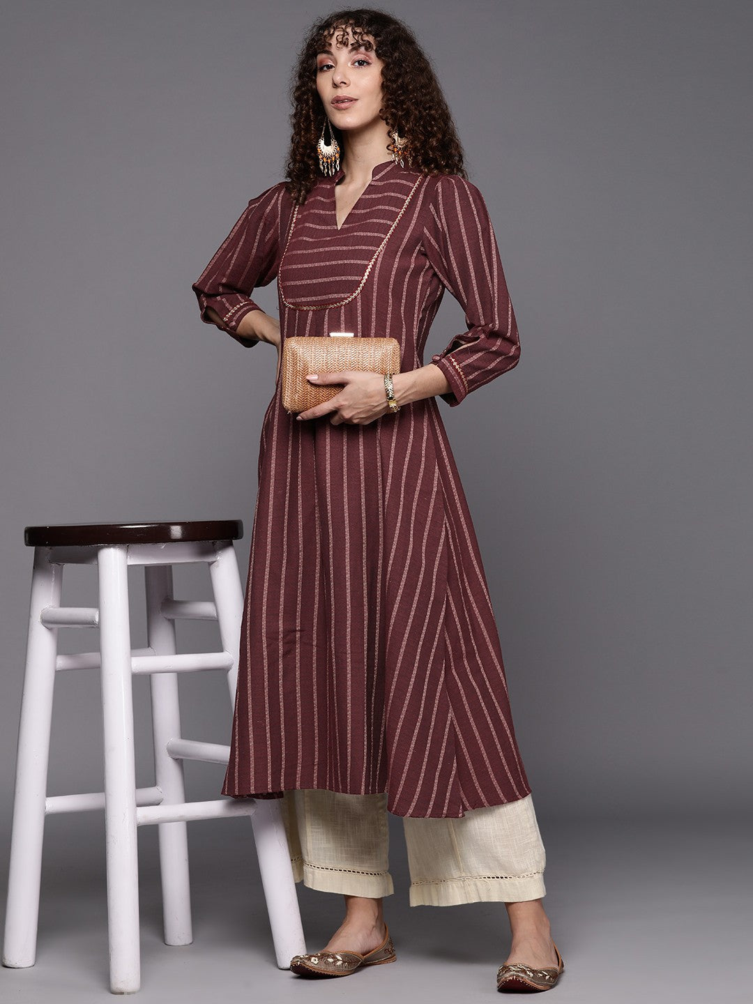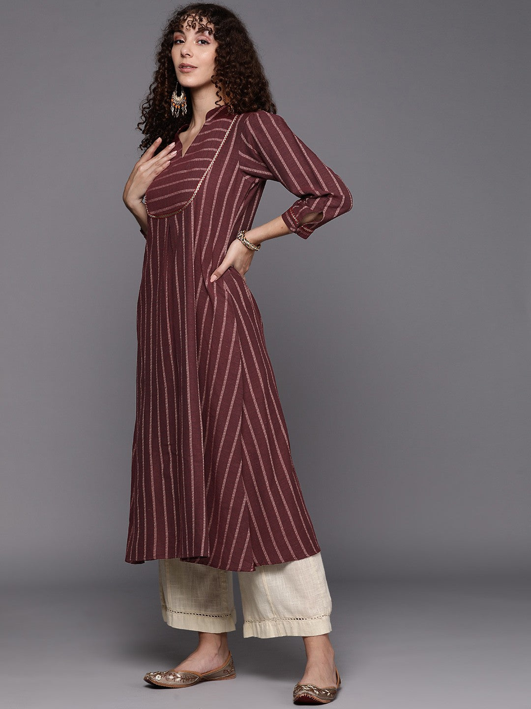 This women's maroon kurta features a classic mandarin collar and striped design, adding a touch of elegance to your wardrobe. The A-line shape and flared hem offer a comfortable and flattering fit, while the machine-woven regular cotton ensures durability and easy care. Perfect for both formal and casual occasions.