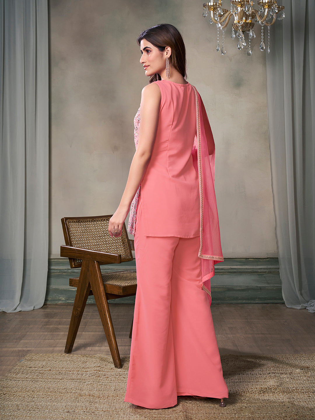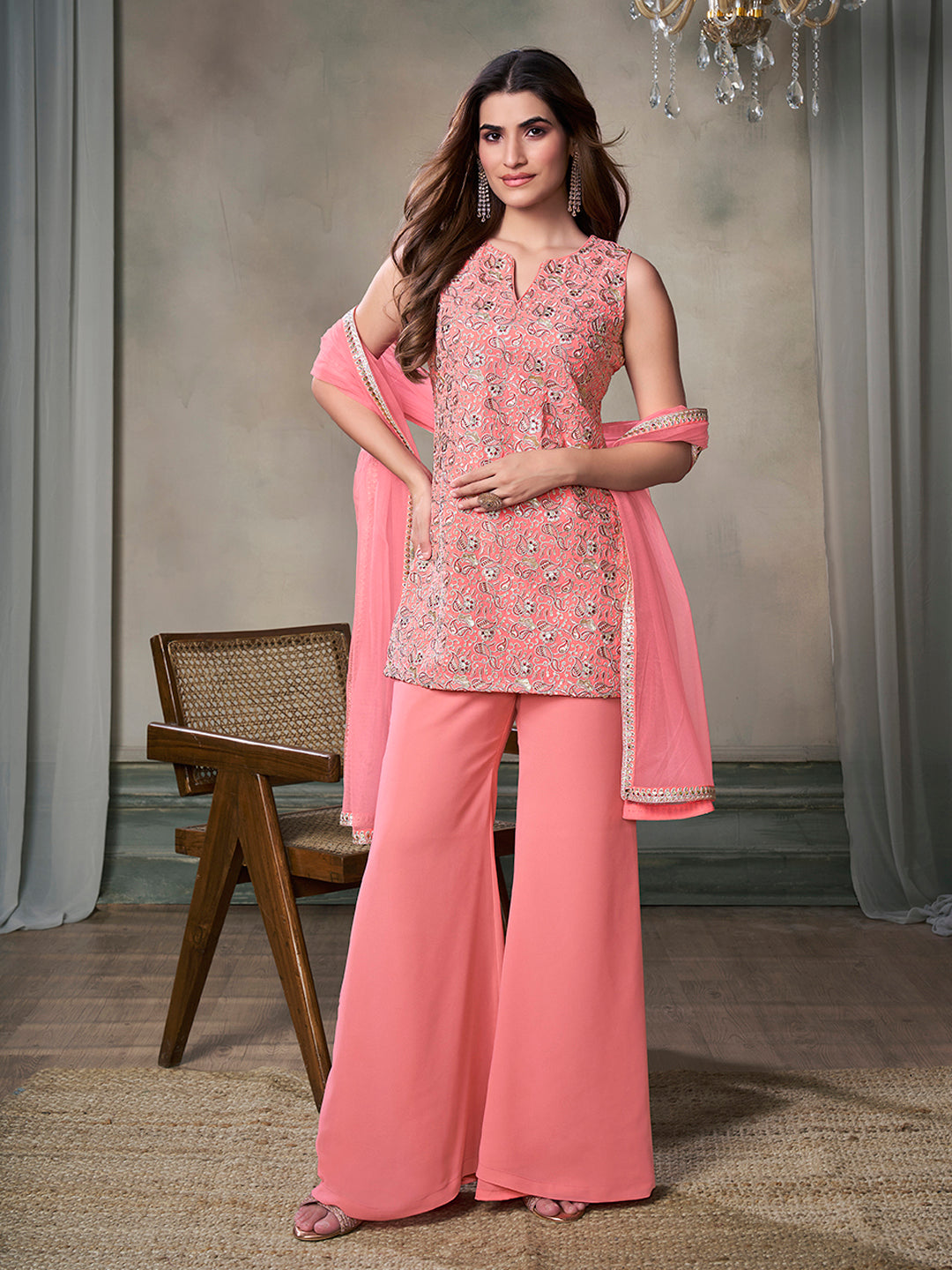 Expertly crafted with delicate paisley embroidery, this peach-colored kurta with sharara set exudes elegance and femininity. Made of high-quality georgette fabric, the kurta features a straight shape, round neck and sleeveless design, while the sharara boasts a partially elasticated waistband for a comfortable fit. Complete with a net dupatta, this set is perfect for any special occasion. Dry clean only.