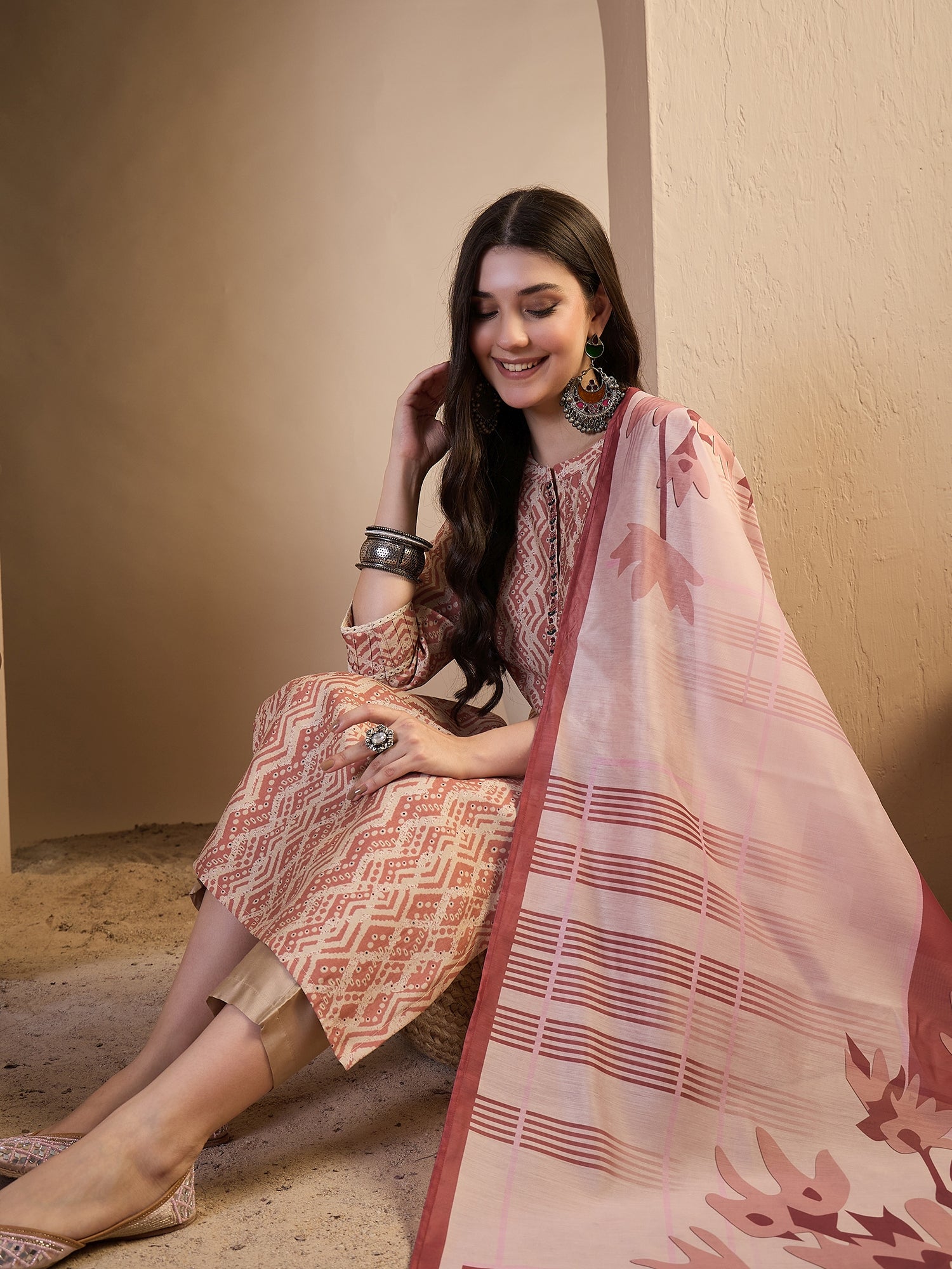 Peach-coloured printed Kurta with Trousers with dupatta