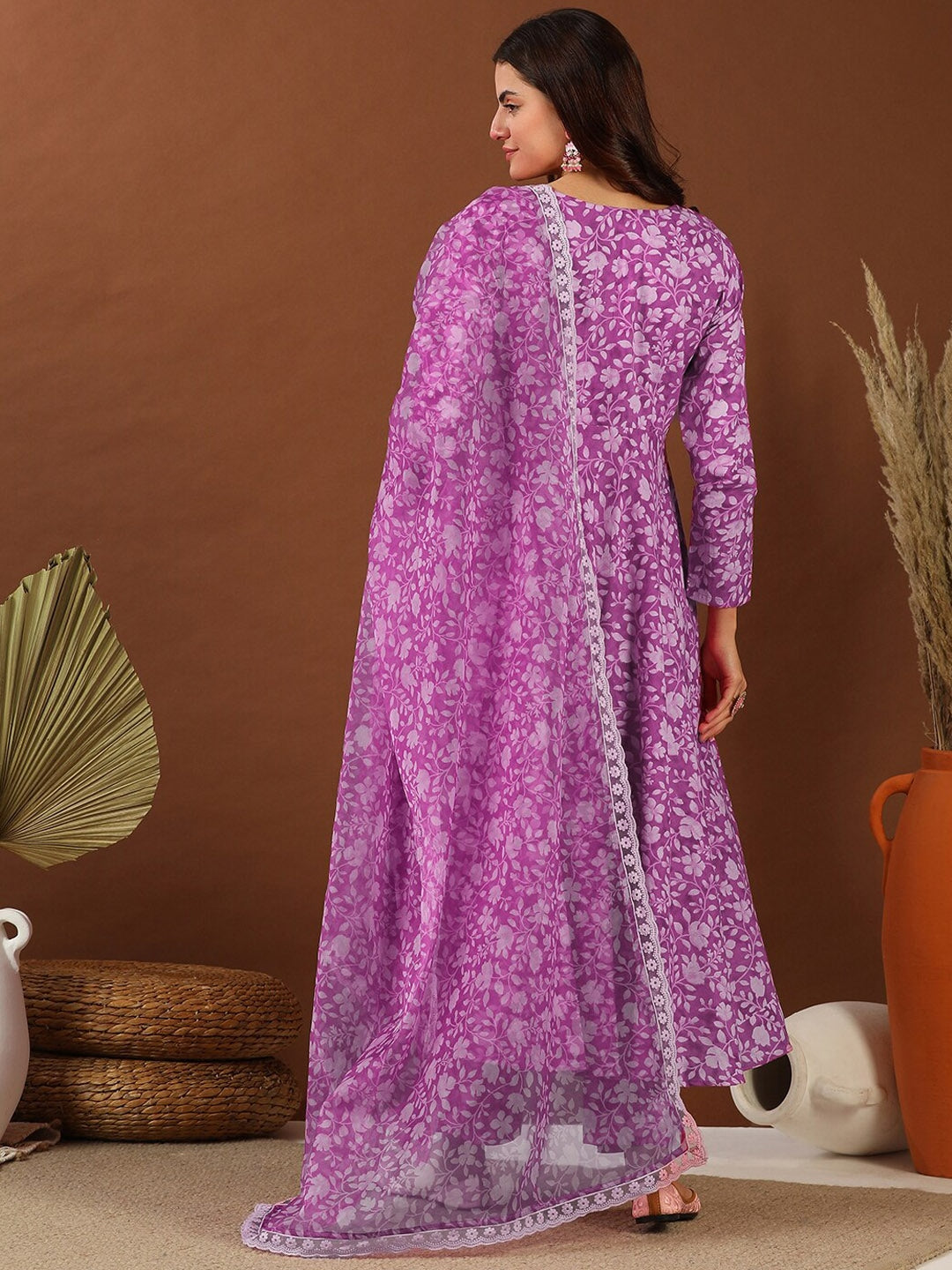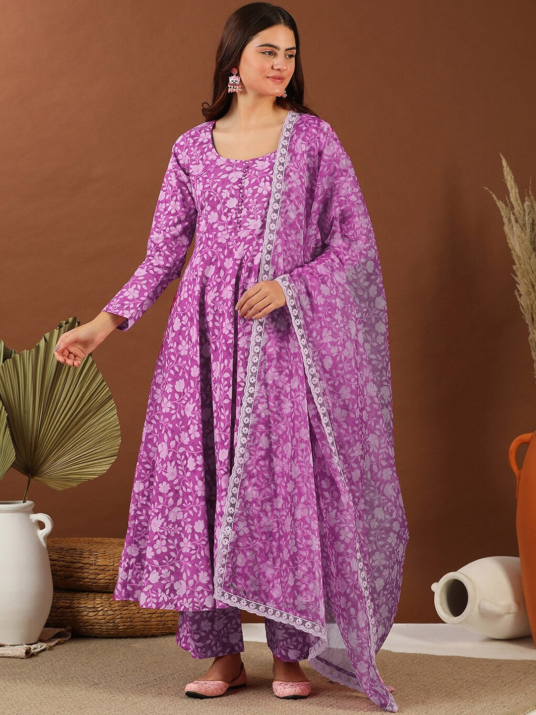 This Women Purple Floral Printed Anarkali Kurta Set is the perfect addition to your wardrobe. Crafted from comfortable cotton blend fabric, the floral print gives it an elegant look. The Anarkali shape and U-neck design add a touch of sophistication. The set also includes printed trousers with a partially elasticated waistband for comfort.
