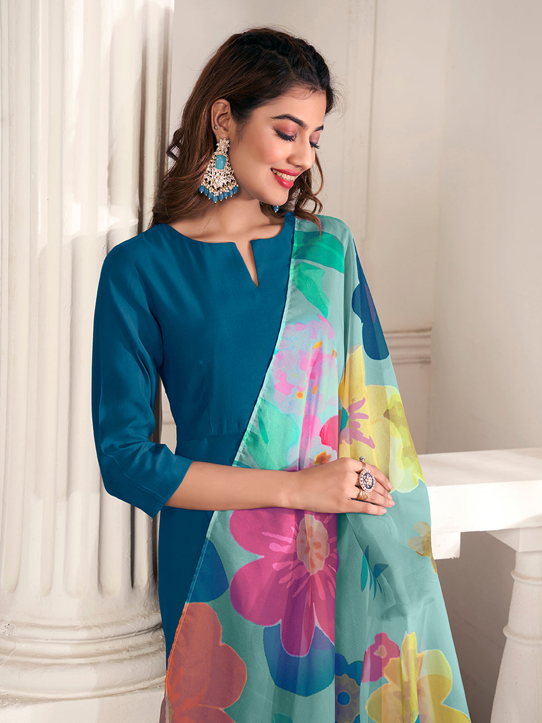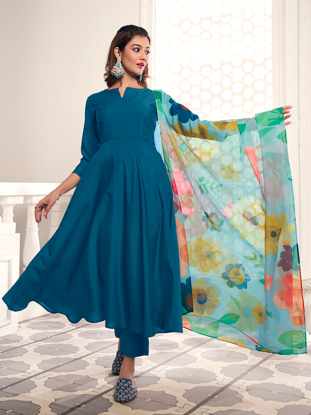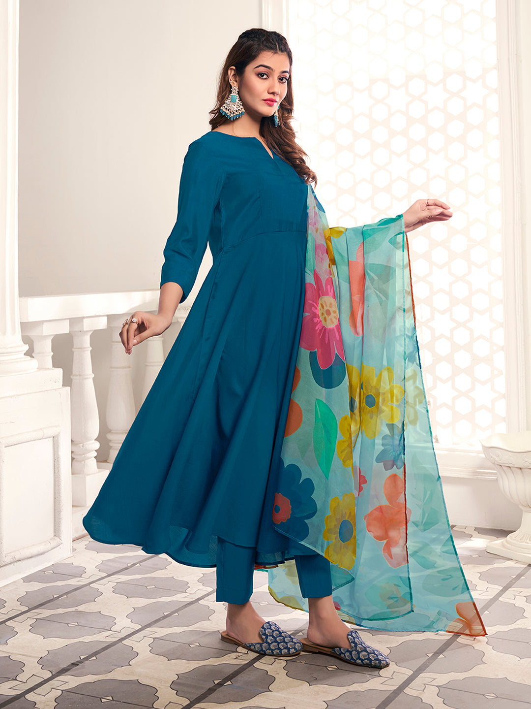 Elevate your ethnic wear collection with our teal solid Kurta, Trousers, and Dupatta set. The Anarkali shape and regular style add a touch of elegance, while the silk blend machine weave fabric ensures comfort and durability. The Kurta features a round neck, three-quarter sleeves, and a flared hem, while the Trousers have a partially elasticated waistband for a perfect fit. Complete the look with the organza Dupatta. Dry clean only.