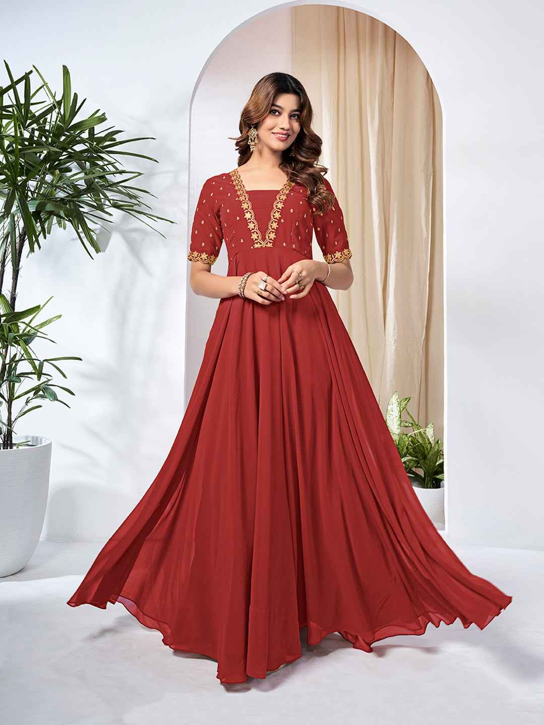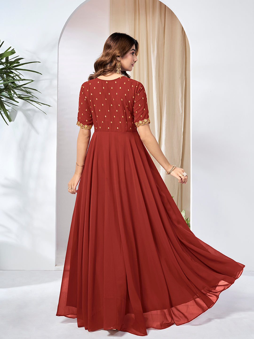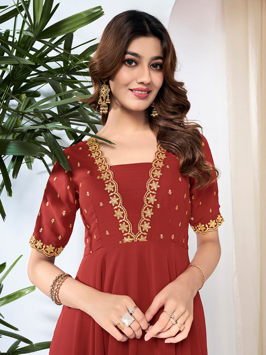 Expertly crafted with intricate sequinned embroidery, this rust ethnic dress is designed to flatter with its fit and flare shape. Featuring a square-neck and short sleeves, it slips on effortlessly for a stylish and comfortable look. Complete with a flared hem, this dress is perfect for any occasion.