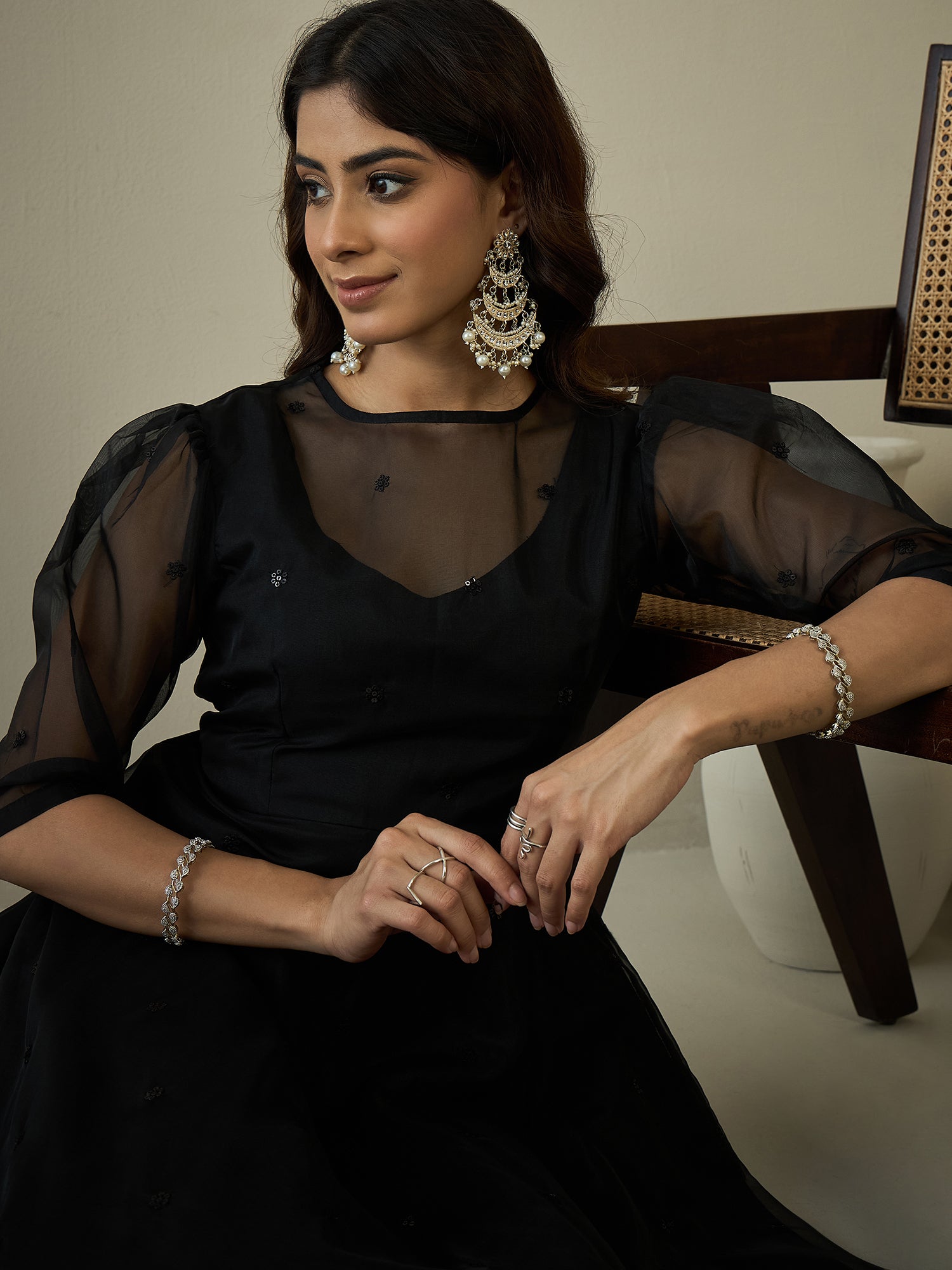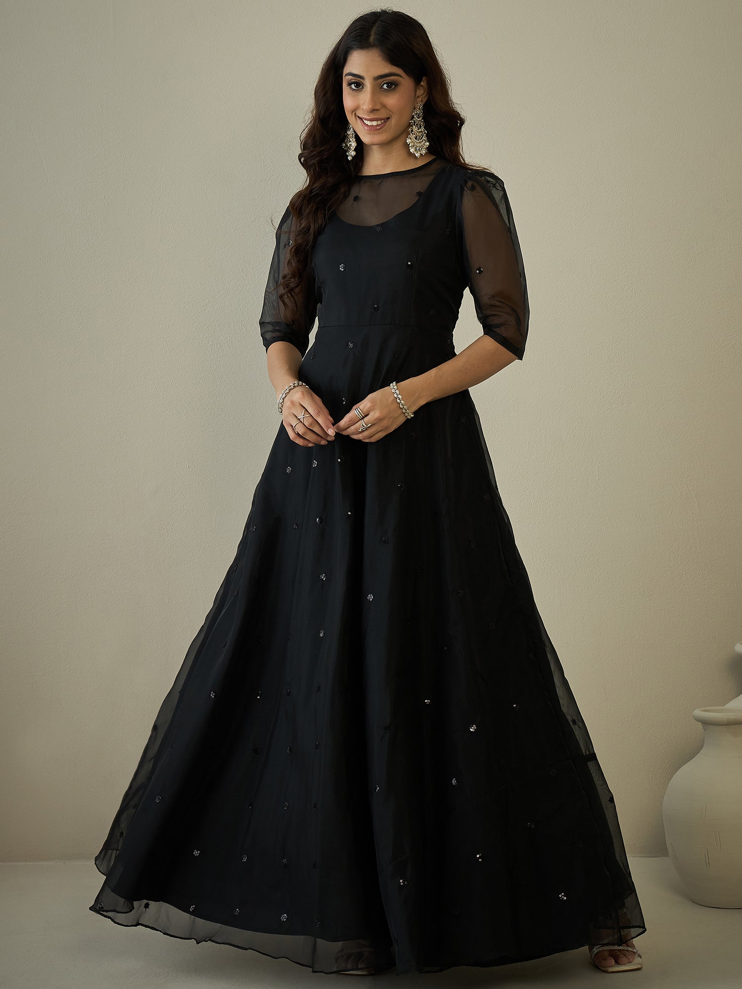 Discover effortless style with our Women's Black Sequinned Embroidered Ethnic Dress. This stunning fit and flare dress features intricate embroidery, a flattering flared hem, and a slip-on closure for added convenience. Perfect for any occasion, this dress will elevate your wardrobe with its elegant round neck and three-quarter regular sleeves.