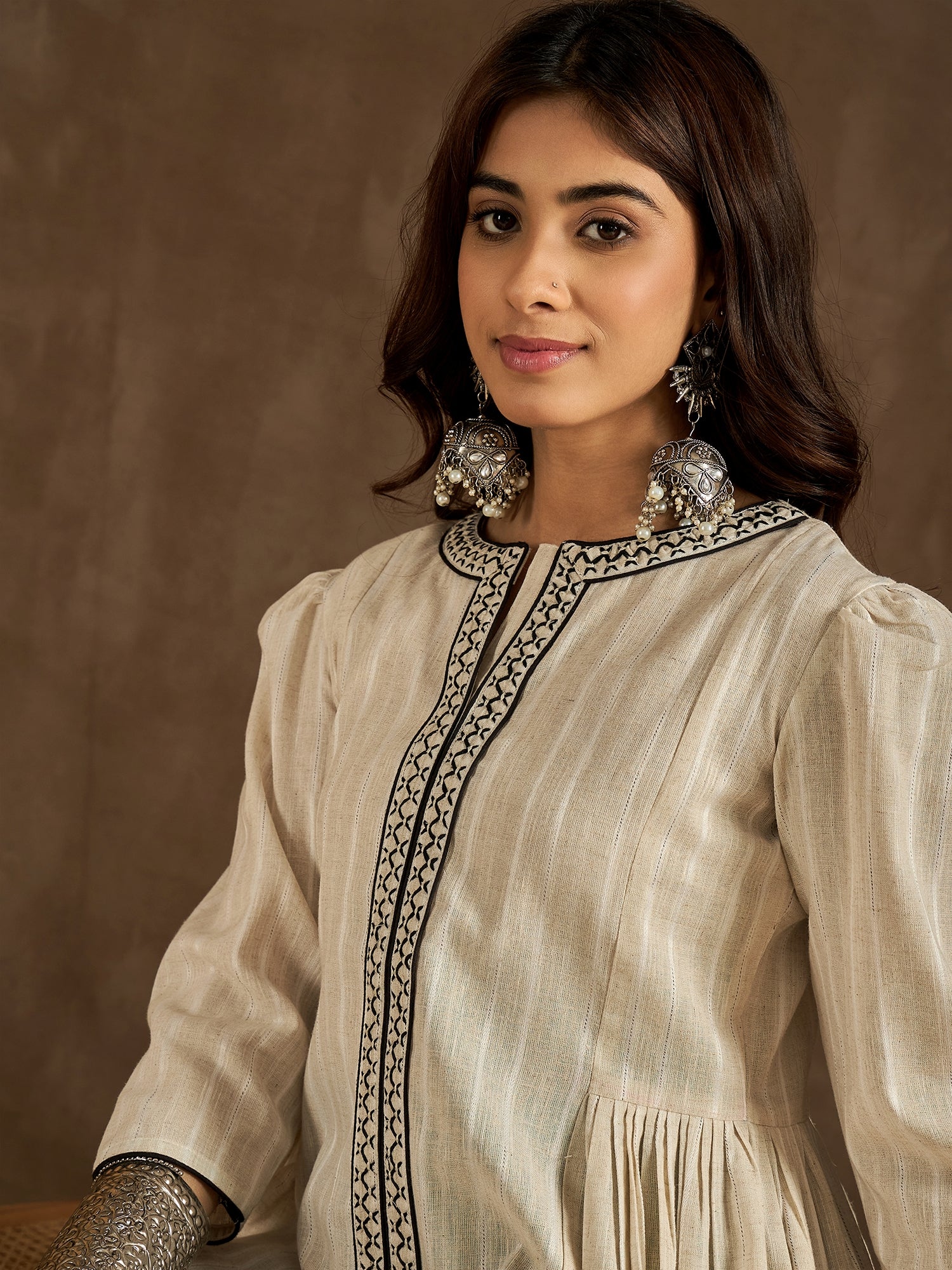 Beige & Black A-Line kurta for Women