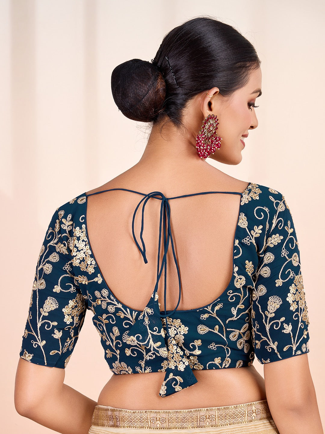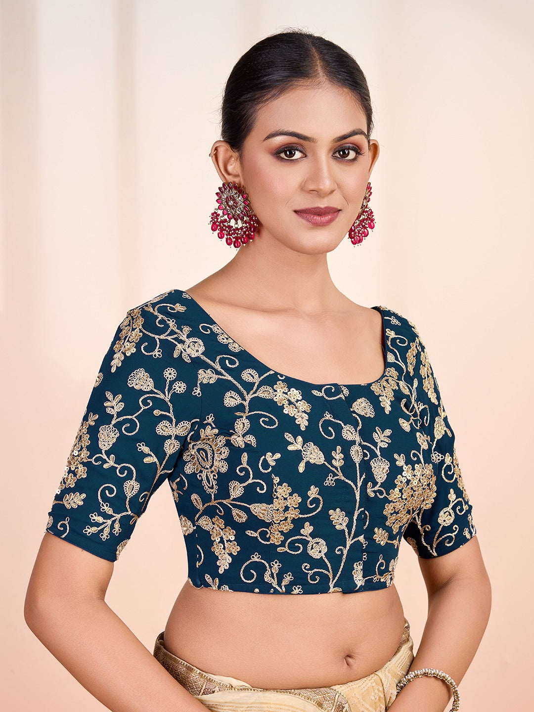 As an expert in fashion, I present to you our Teal embroidered blouse. This piece features a round neck, short sleeves, and hook and eye closure with tie-up detail. Made with high-quality material, it adds a touch of elegance to any saree. Perfect for any occasion, this blouse guarantees comfort and style.