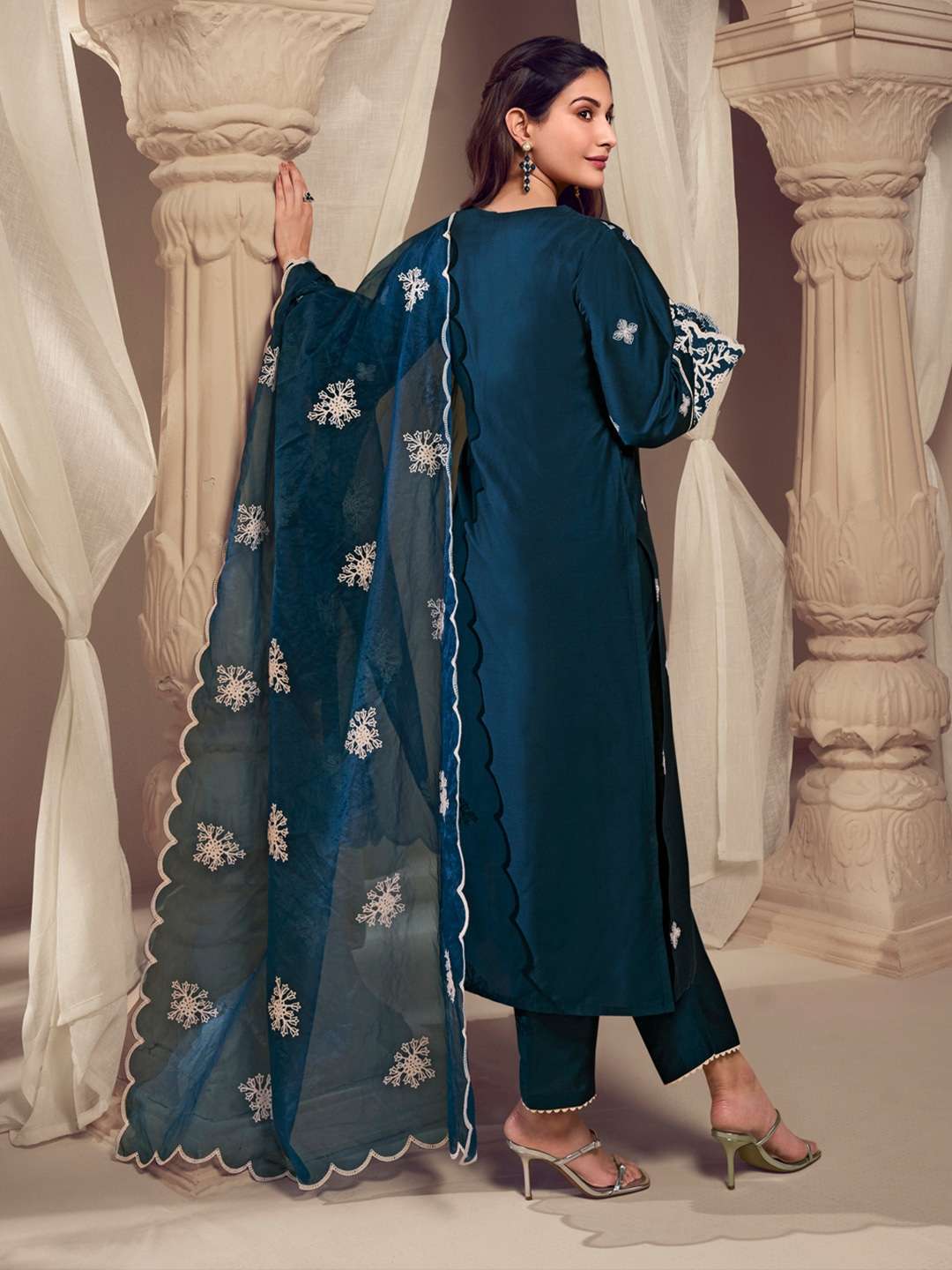 Elevate your ethnic wardrobe with our Amyra Dastur Women Teal Floral Embroidered Kurta set. Made from pure silk, it features intricate floral embroidery, a round neck, and long flared sleeves. The partially elasticated waistband ensures a comfortable fit for the solid trousers, while the matching dupatta completes the look.