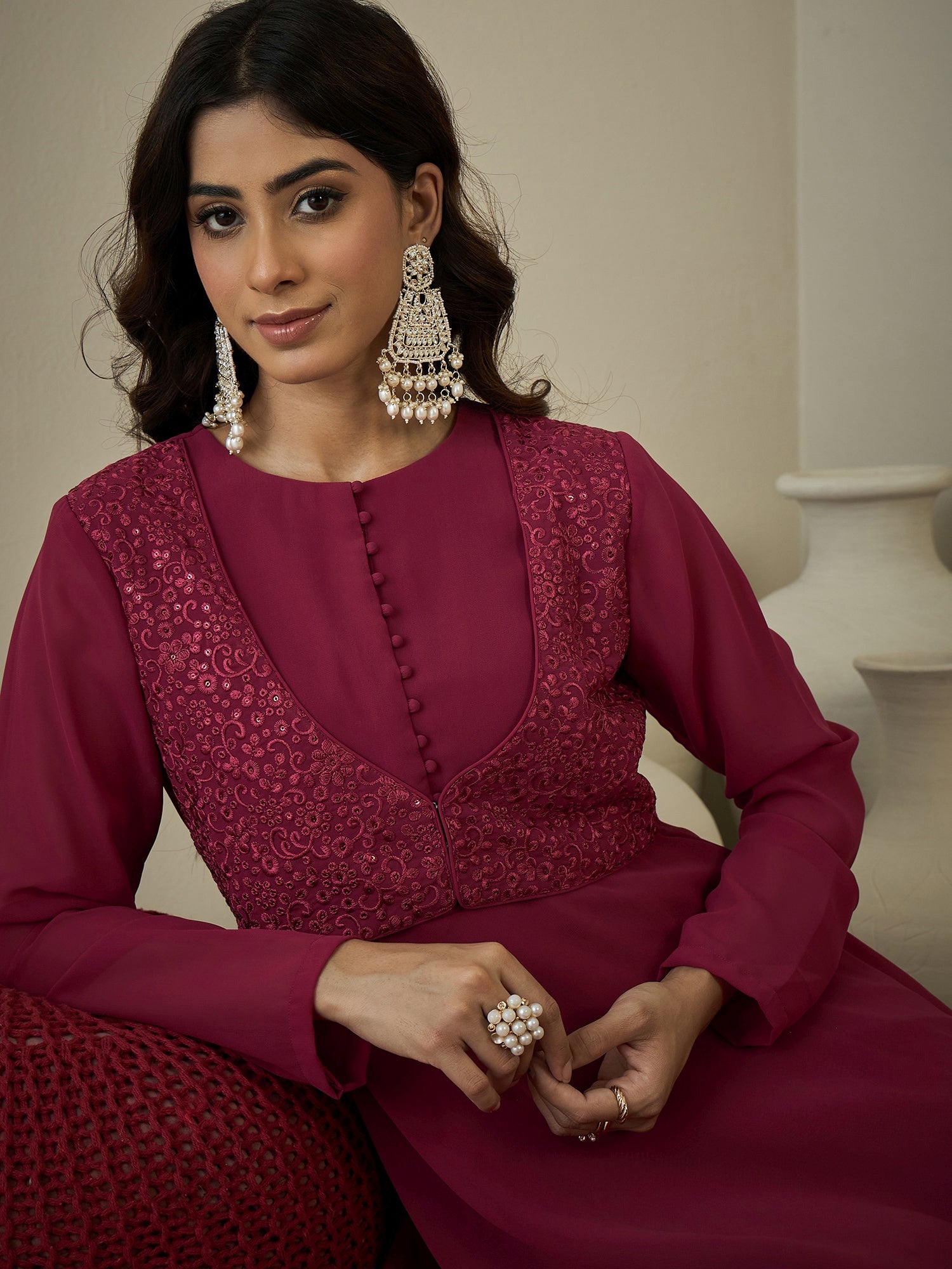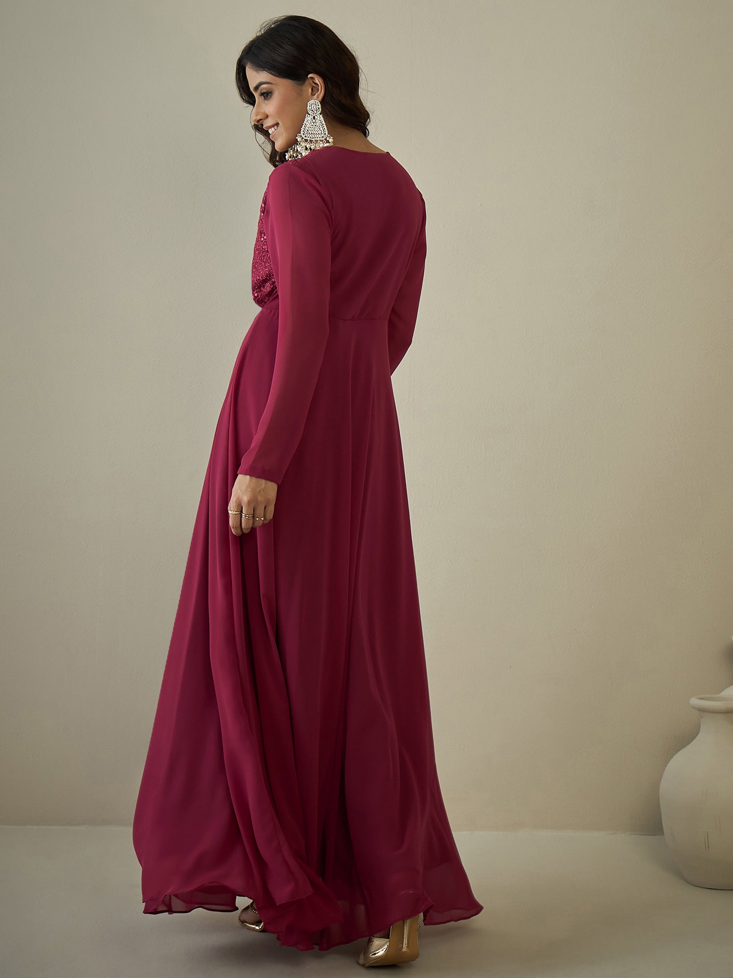 Elevate your ethnic wardrobe with our Women's Ethnic Motifs Sequinned Embroidered Maxi Ethnic Dress. This rust dress features intricate sequinned embroidery for a touch of elegance. The fit and flare shape, round neck, full sleeves, and flared hem provide a flattering silhouette. Slip it on for effortless style.