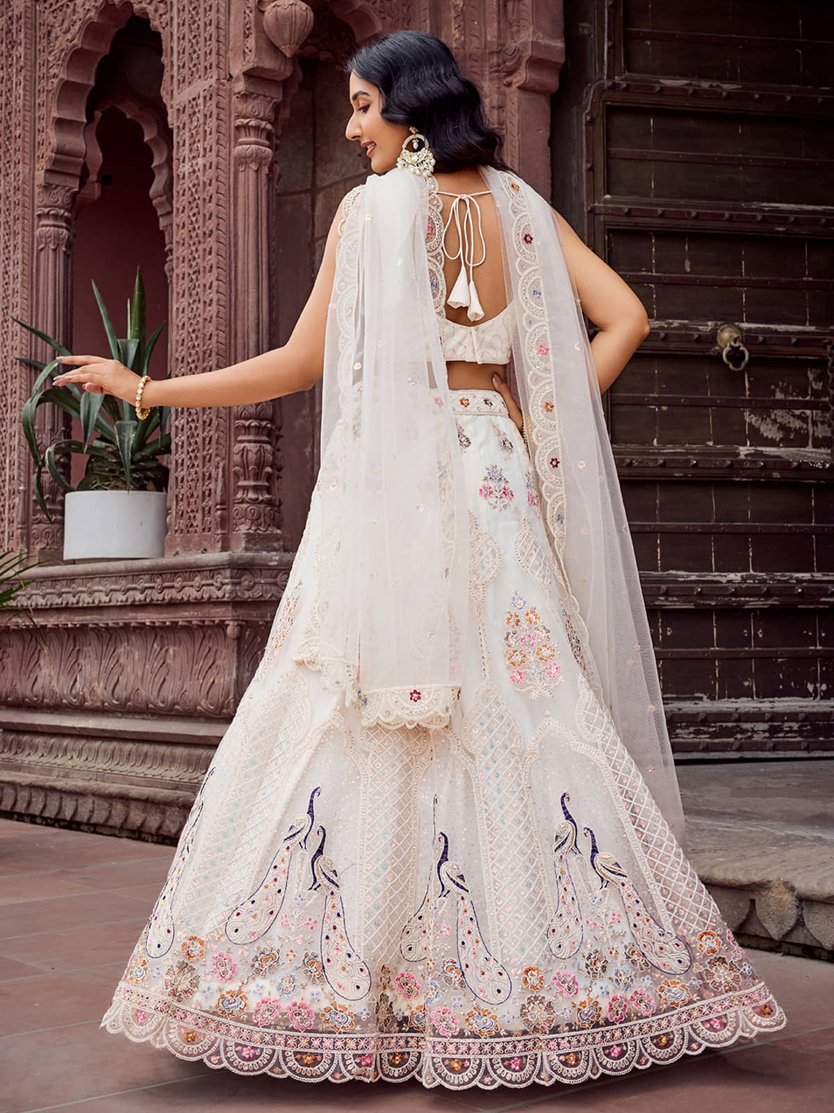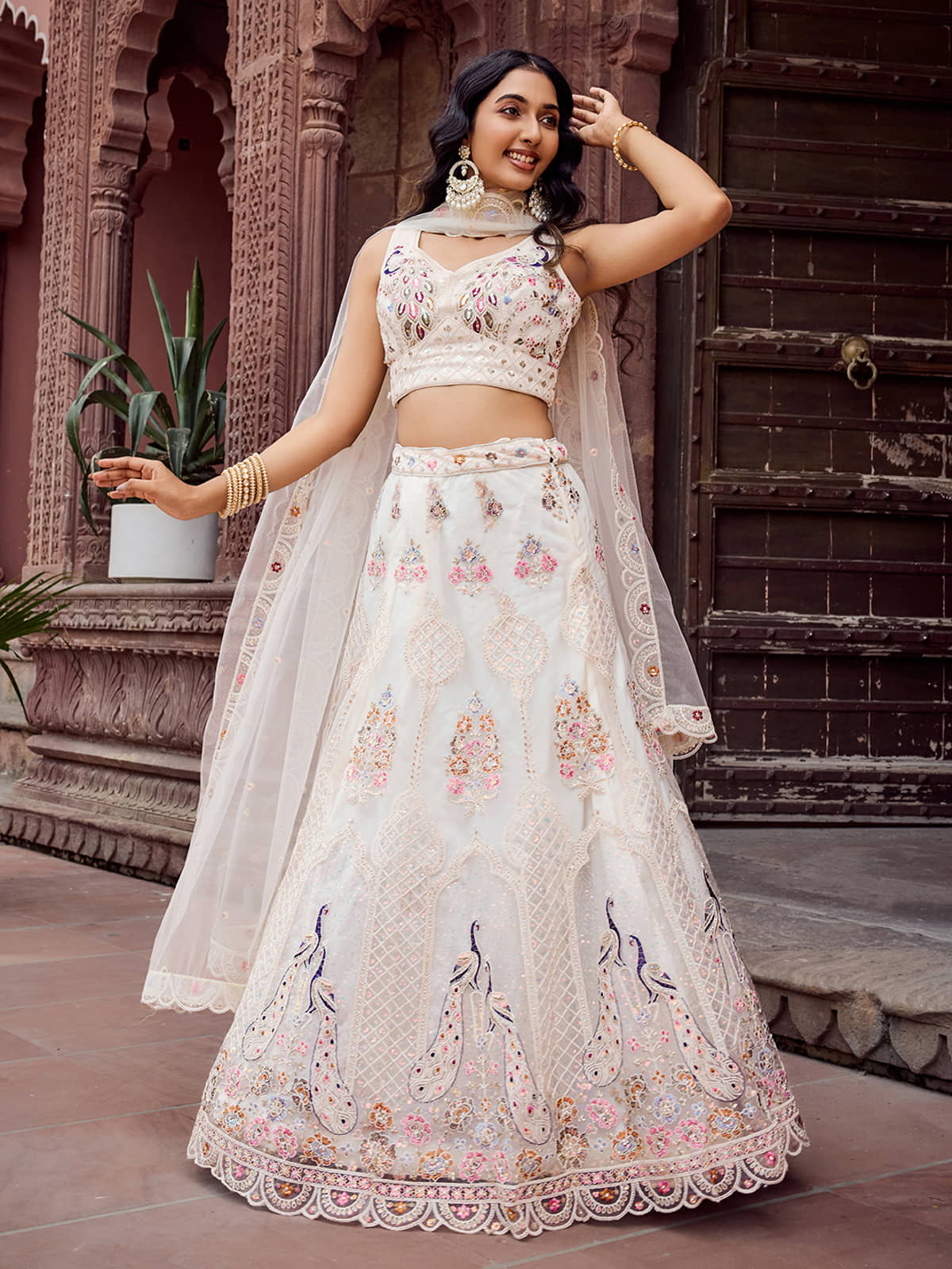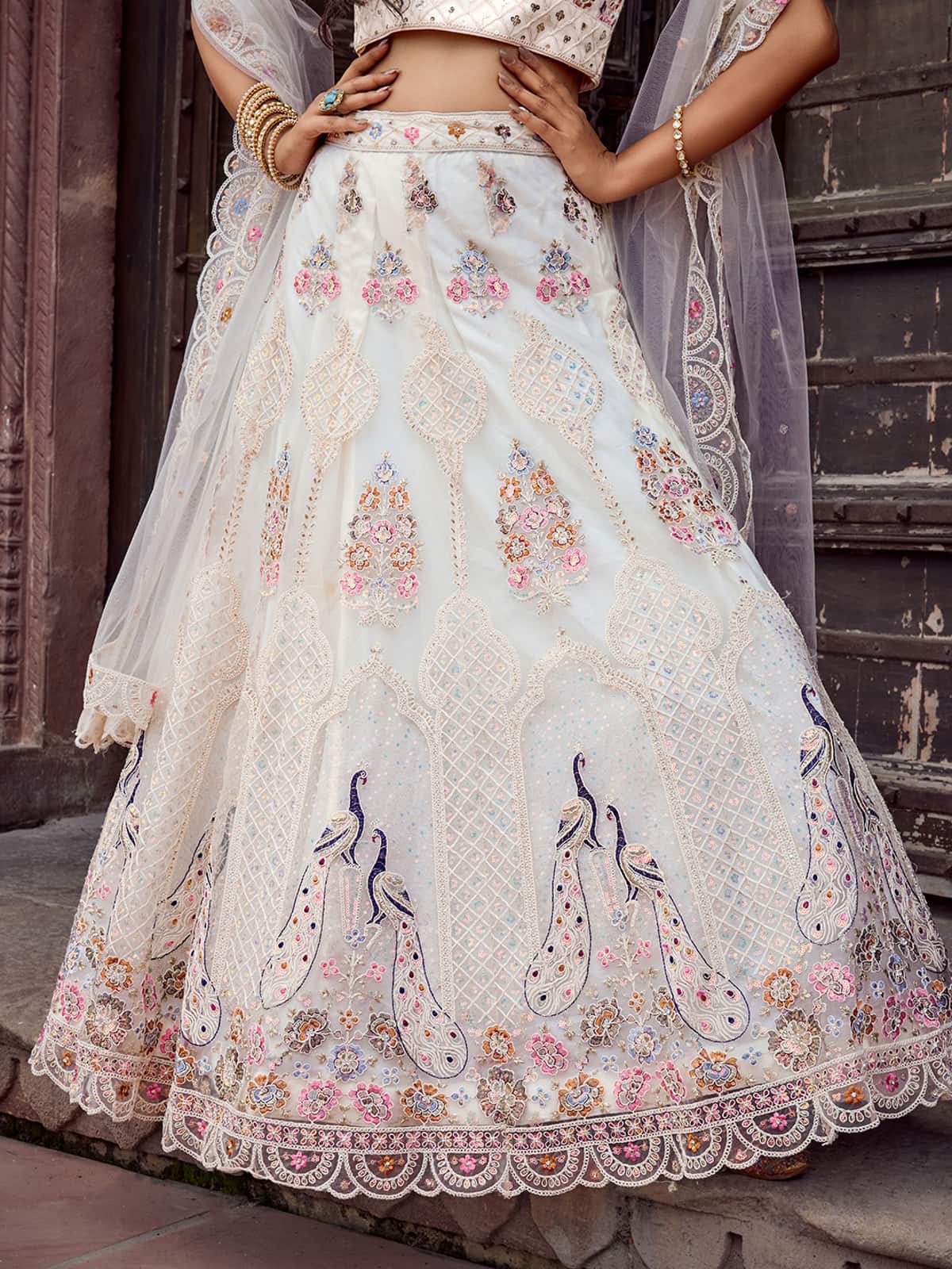 Elevate your ethnic wardrobe with this exquisite cream lehenga set, crafted from premium net fabric with sophisticated sequin and stone embellishments. The semi-stitched lehenga features intricate coding work, delicate thread embroidery, and a refined cutwork border at the hemline. Designed with a generous 3.5-meter flair and reinforced with shantoon inner lining, can-can, and buckram layers for optimal structure and comfort. The matching sweetheart-neckline blouse showcases heavy sequin detailing and coordinating embroidery work with an attached inner. Complete the ensemble with the ornate cream net dupatta, adorned with elaborate coding and cutwork embroidery. Perfect for weddings, celebrations, and special occasions where timeless elegance meets contemporary craftsmanship.