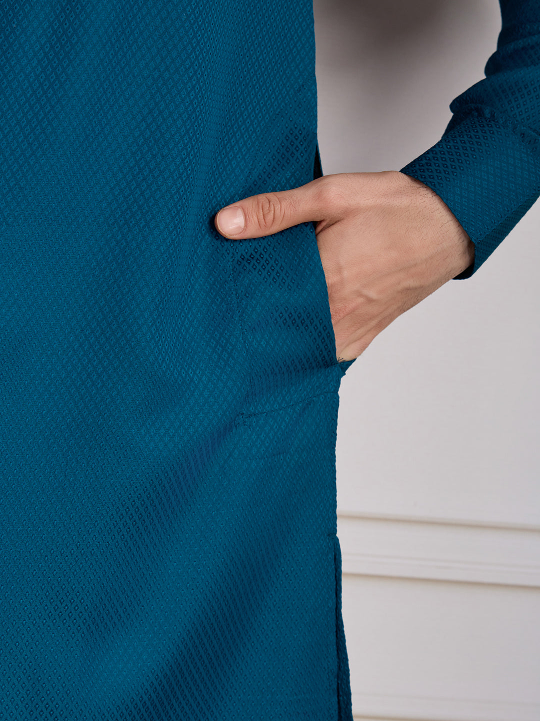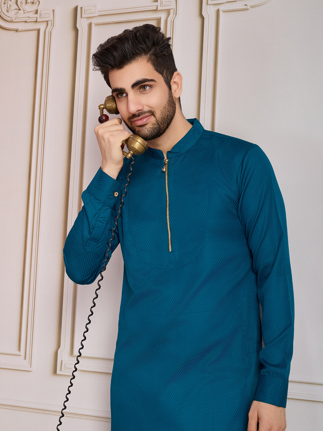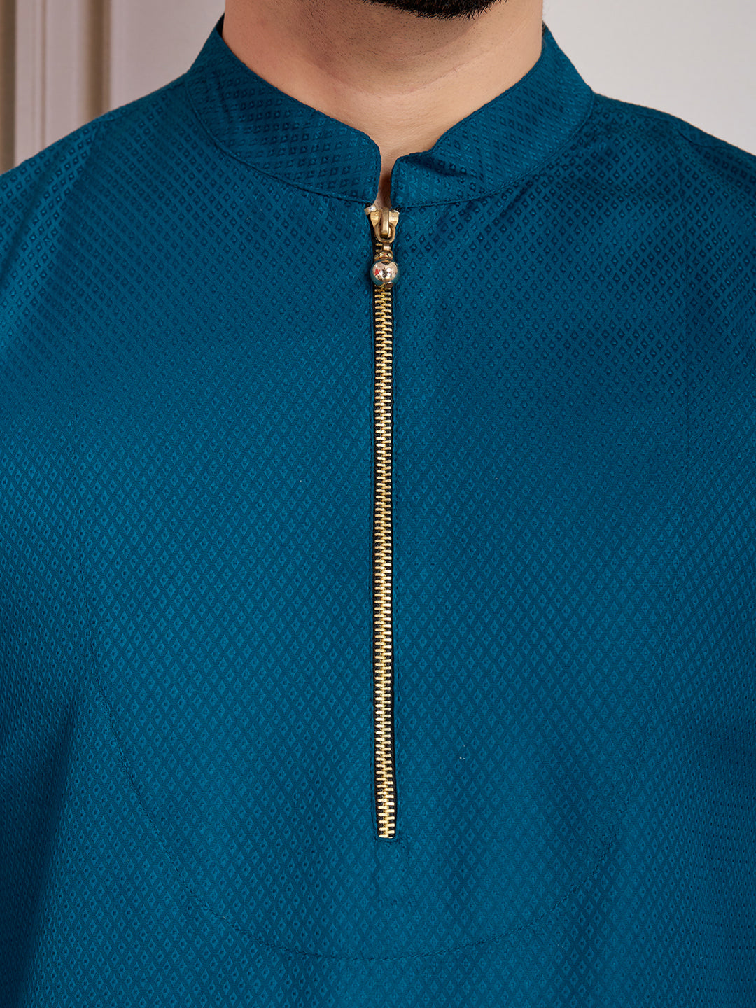 Upgrade your style with our Woven Design Jacquard Straight Kurta Set. This elegant set includes a teal blue kurta with a woven design and mandarin collar neck, along with white solid trousers featuring a zip closure. Made from a machine-woven regular cotton blend, the kurta set is designed for comfort and durability. Elevate your wardrobe with this stylish and versatile set.