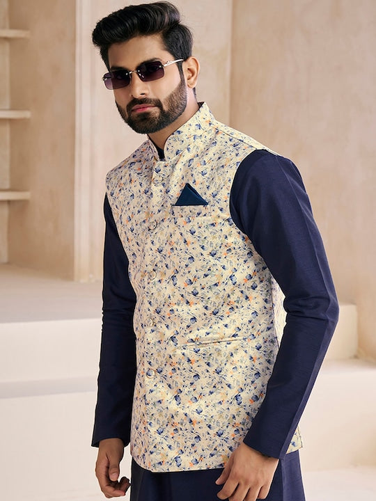 This stylish Nehru Jacket has a unique woven design in off-white and blue that will add a modern touch to your wardrobe. It features a mandarin collar, a full button placket, and three pockets for all your essentials. Elevate your look to a whole new level with this fashionable garment.
