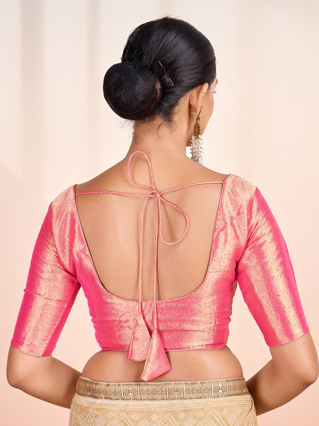 Expertly designed for comfort and style, our Pink Gold Woven Saree Blouse features a round neck and short sleeves for a modern look. The hook and eye closure and tie up details add a touch of elegance. Perfectly complement any saree with this versatile and chic blouse.