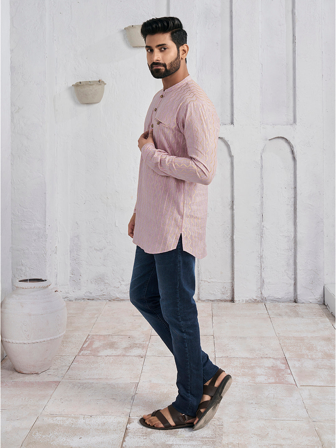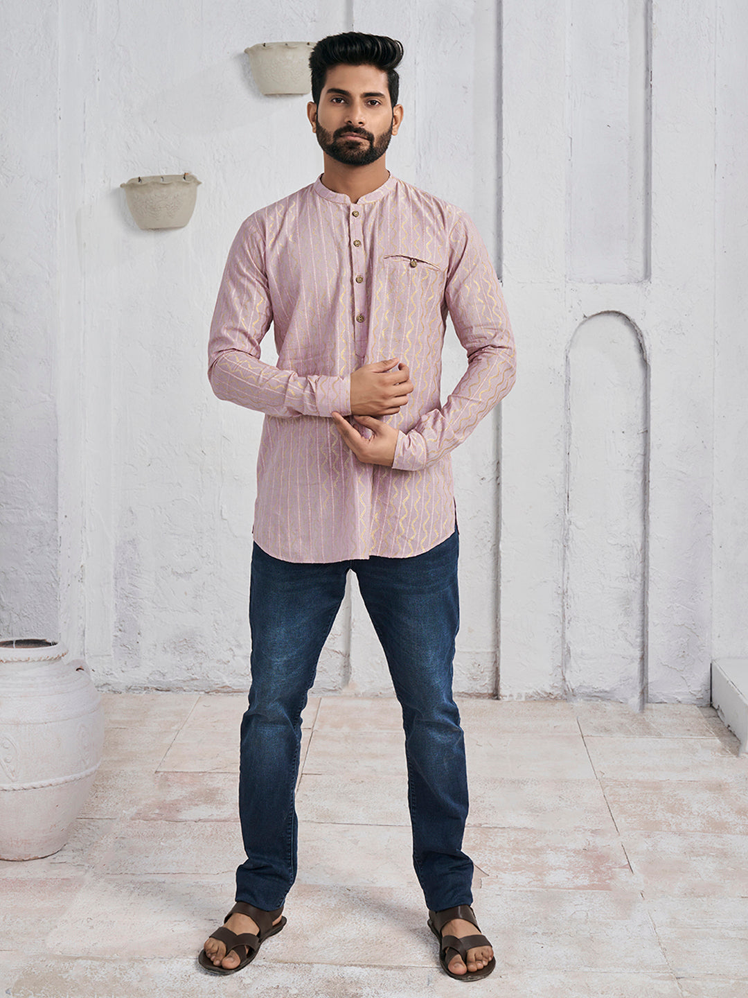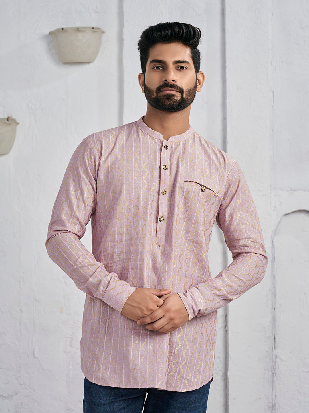 As a product expert, explore the intricate beauty and comfort of this pink and gold toned Woven Designed Band Collar Cotton Jacquard Straight Kurta. The abstract woven design and Mandarin collar adds a touch of sophistication, while the long sleeves and curved hem provide a cozy fit. Made with machine weave regular cotton, it's both stylish and easy to maintain. Dry clean recommended.