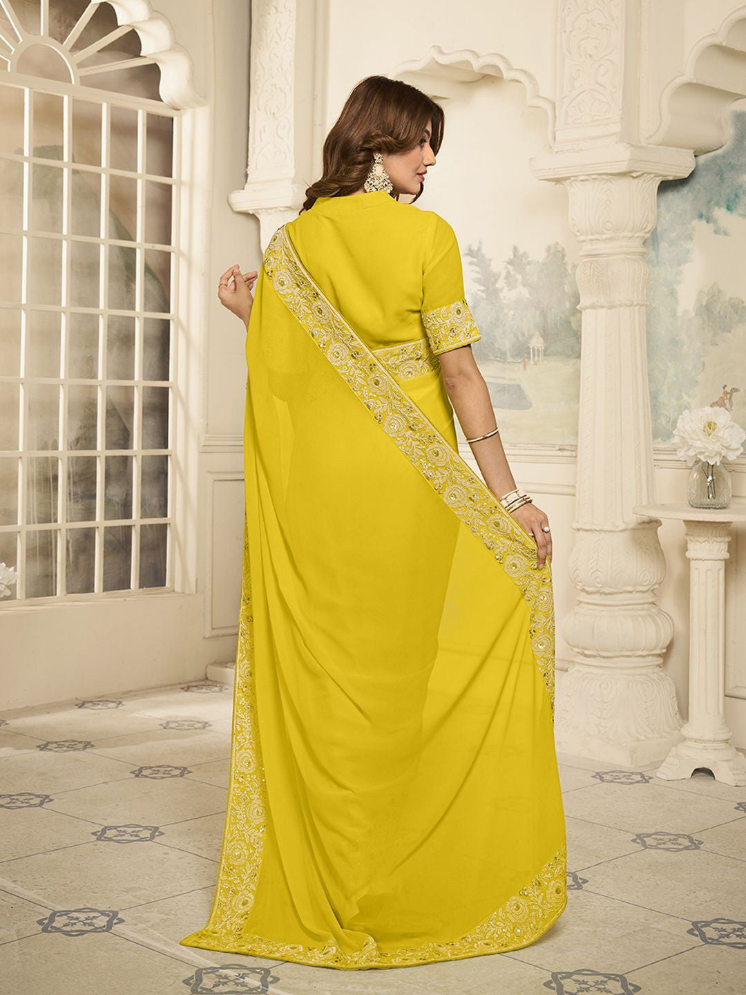 This vibrant Yellow Embroidered Poly Georgette Saree will add a touch of elegance to any occasion. Featuring a solid yellow saree with gold-toned embroidered border and detailed design, this saree offers a timeless and classy look. Made from high-quality fabric, it also comes with an unstitched blouse piece for added convenience.