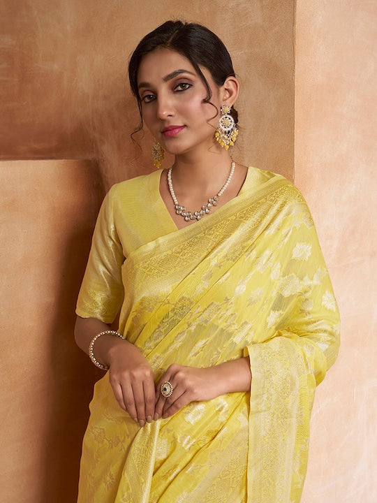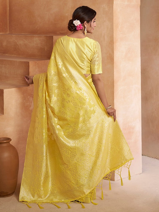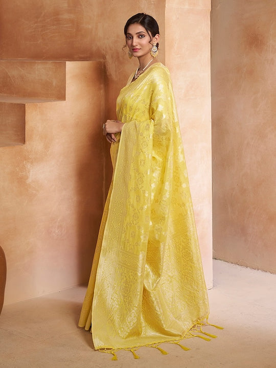 This stunning Yellow Ethnic Motif Woven Design Zari Saree is a beautiful addition to any wardrobe. The vibrant yellow and gold tones are perfect for any occasion. The intricate woven design and zari detailing add an elegant touch to this traditional saree. Complete your look with the included unstitched blouse piece.