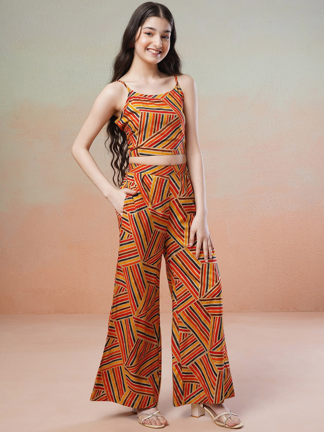 This yellow and brown printed co-ord set includes a regular-fit top with shoulder straps and a slip-on closure, as well as trousers with an elasticated waistband and flared hem. Made for easy and comfortable wear, this set also features 2 side pockets for added functionality. Perfect for the fashion-forward girl who wants to make a statement.
