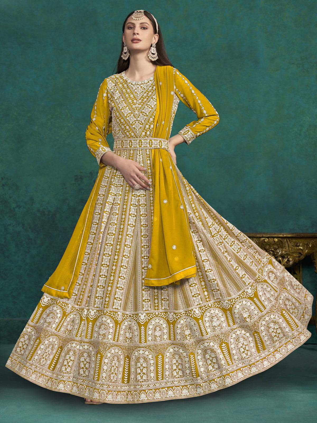 Indulge in the elegance and finesse of the Yellow Lucknowi Embroidery Kalidar Anarkali Suit. Perfect for any festive occasion, this feminine and appealing suit features intricate cording, resham thread, and sequin embroidery in the lucknowi style. The georgette kalidar anarkali top is paired with a solid santoon bottom and an embellished waist belt, while the minimal satin lace and butti enhanced georgette dupatta add to its beauty. Complete your graceful look this wedding season with this designer suit.