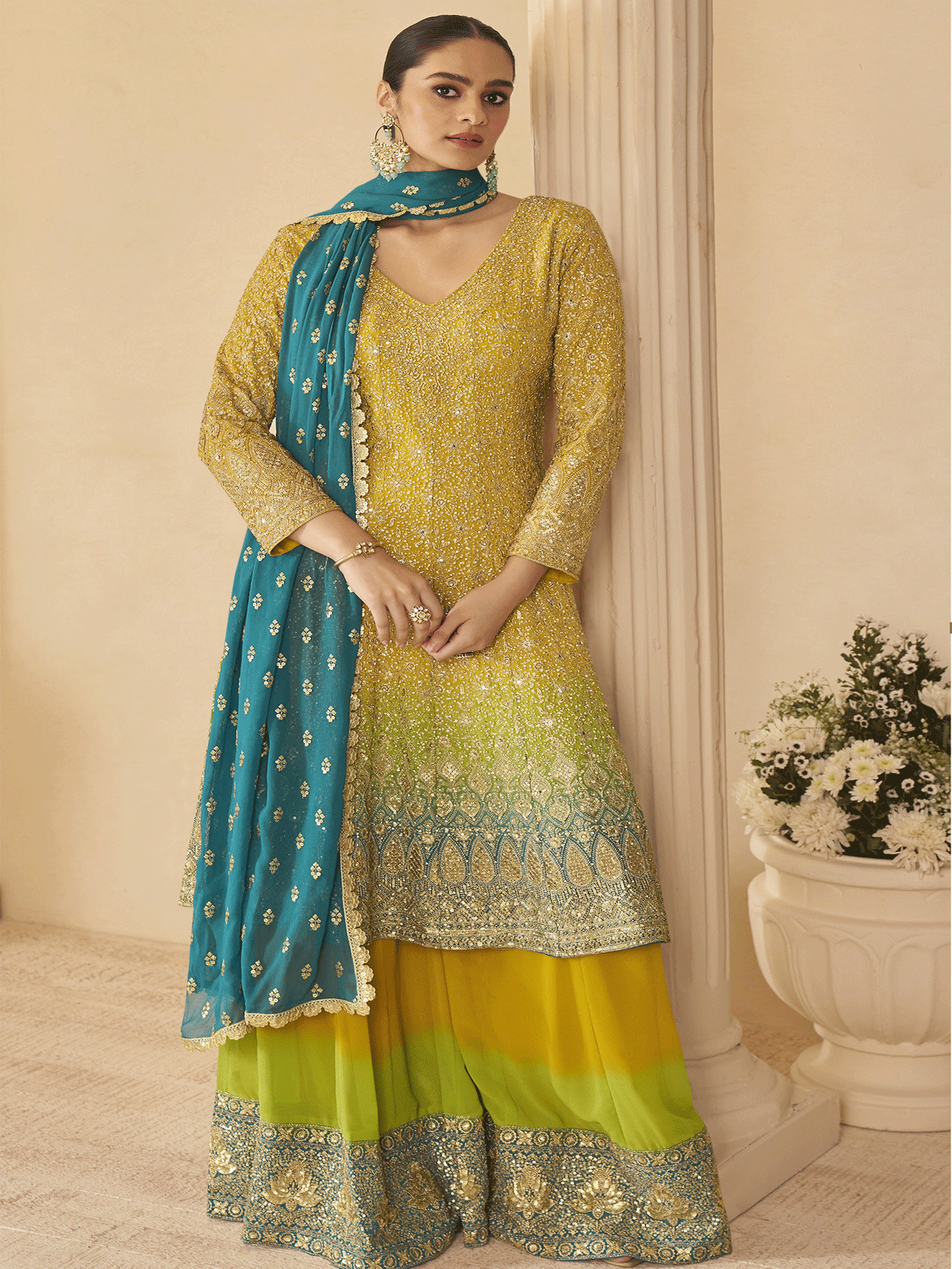 Elevate your occasion wear with this Yellow Multi Embroidered Function Wear Palazzo Suit, a masterpiece of refined craftsmanship. Crafted from premium georgette, this ensemble showcases exquisite hand-embroidery featuring zari, zarkan, sequins, and intricate thread work that seamlessly marries traditional artistry with contemporary aesthetics. The luxurious fabric drapes beautifully, offering both comfort and sophistication for weddings, celebrations, and formal gatherings. Perfect for the discerning woman who appreciates quality and timeless elegance.